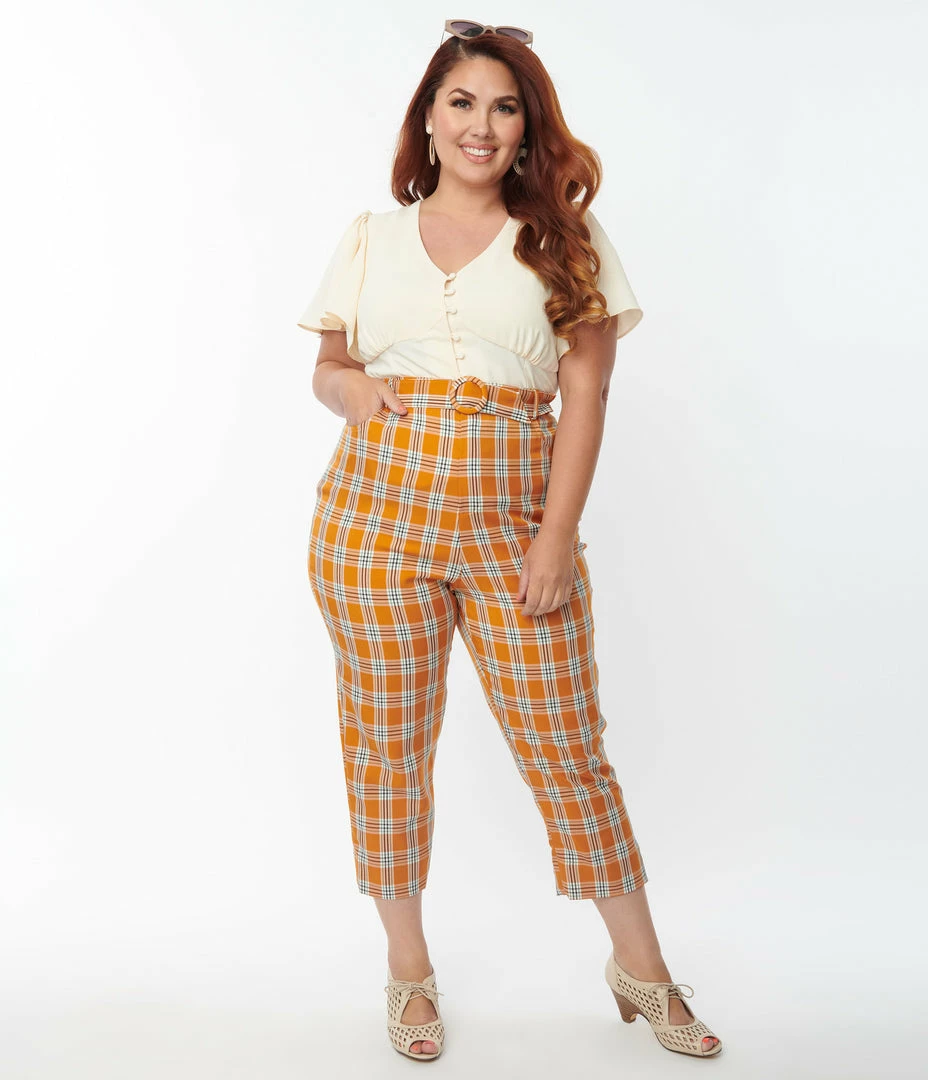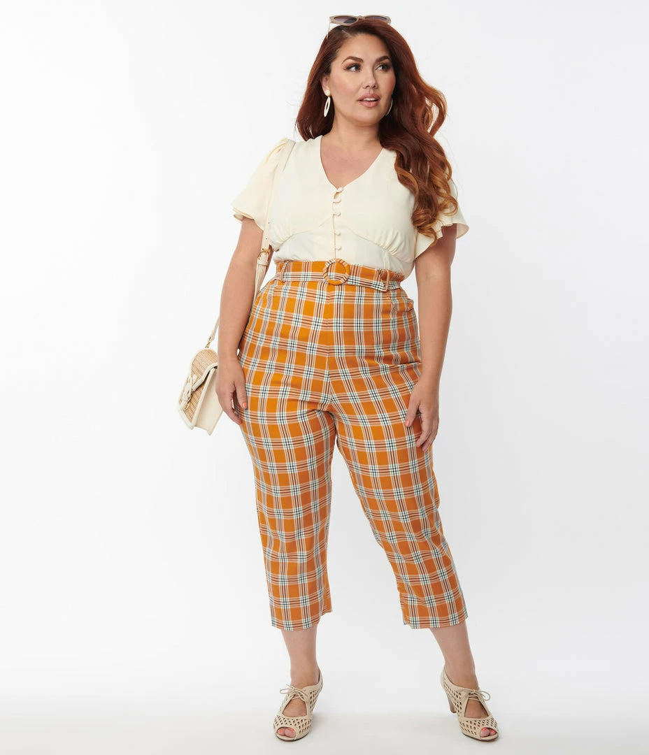 Buy 🎁 Unique Vintage Plus Size Orange Plaid Belted Crop Pants 👏