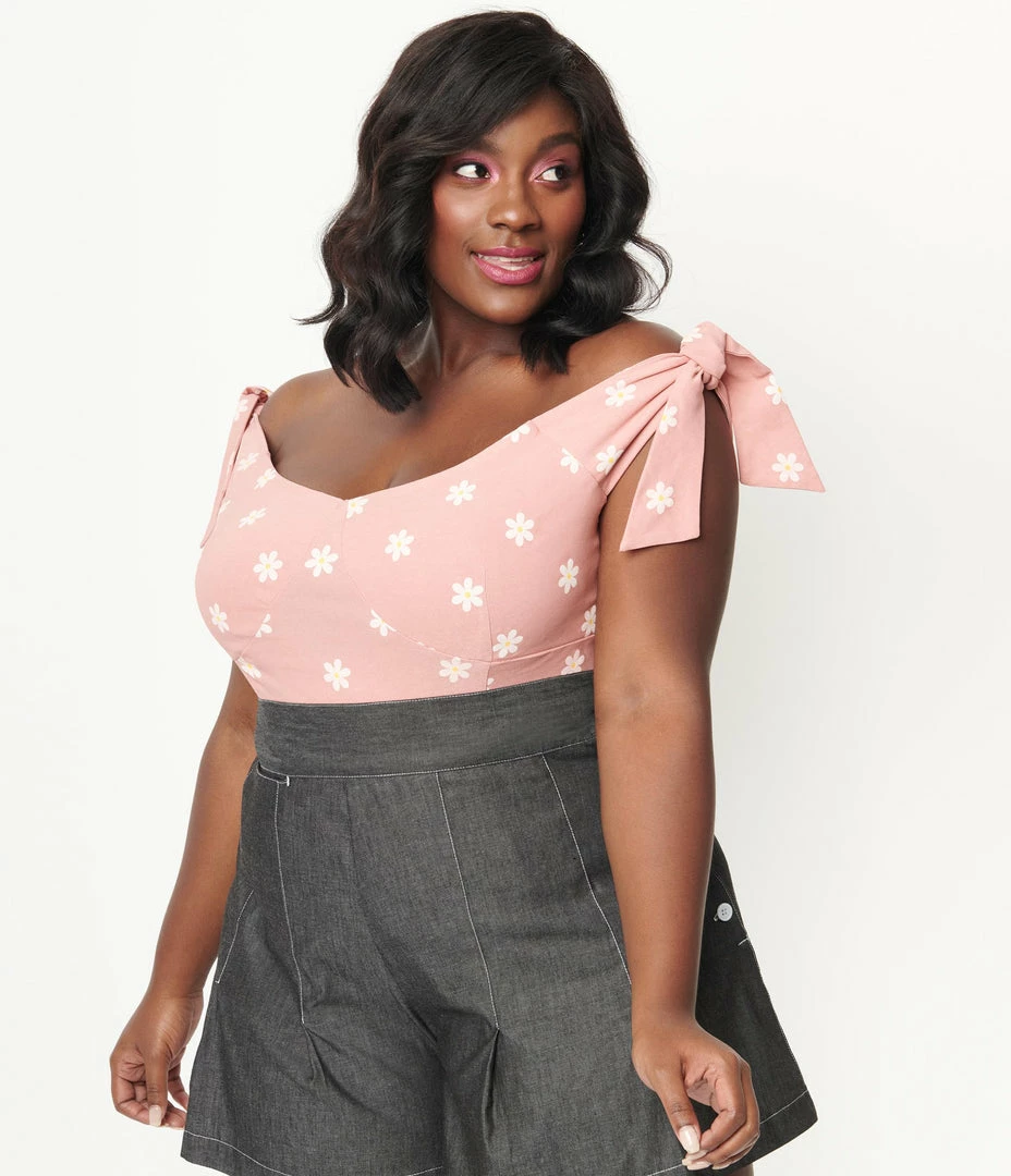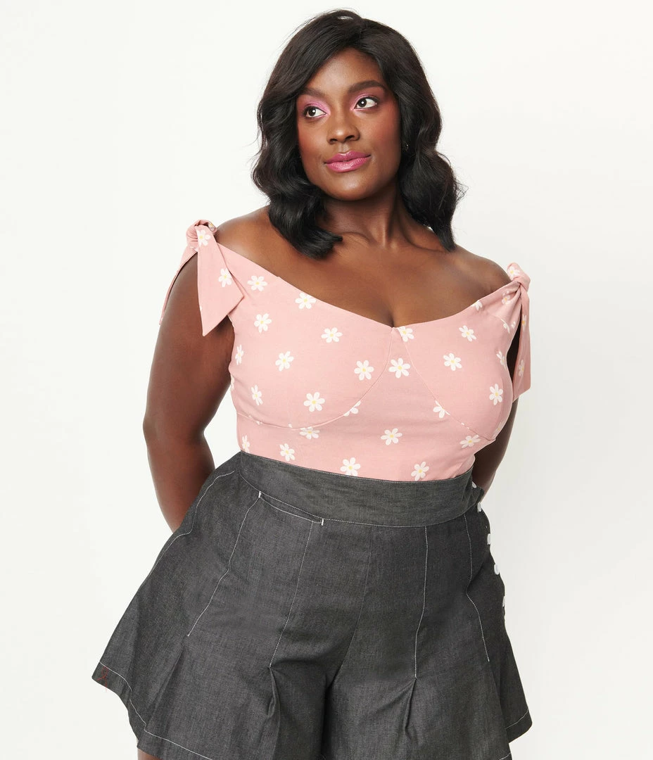 Wrap them around your finger, dears! Throw shade over your shoulders and forget the haters in the plus size Violet Top from Unique Vintage, a marvelous separate crafted in a fabulous rose pink stretch blend that dances with white daisies printed throughout. The sexy sweetheart neckline features self tie shoulder straps that provide a ravishing off the shoulder design while the paneled waist is cinched with a back zipper for a flattering fit to your feminine form!