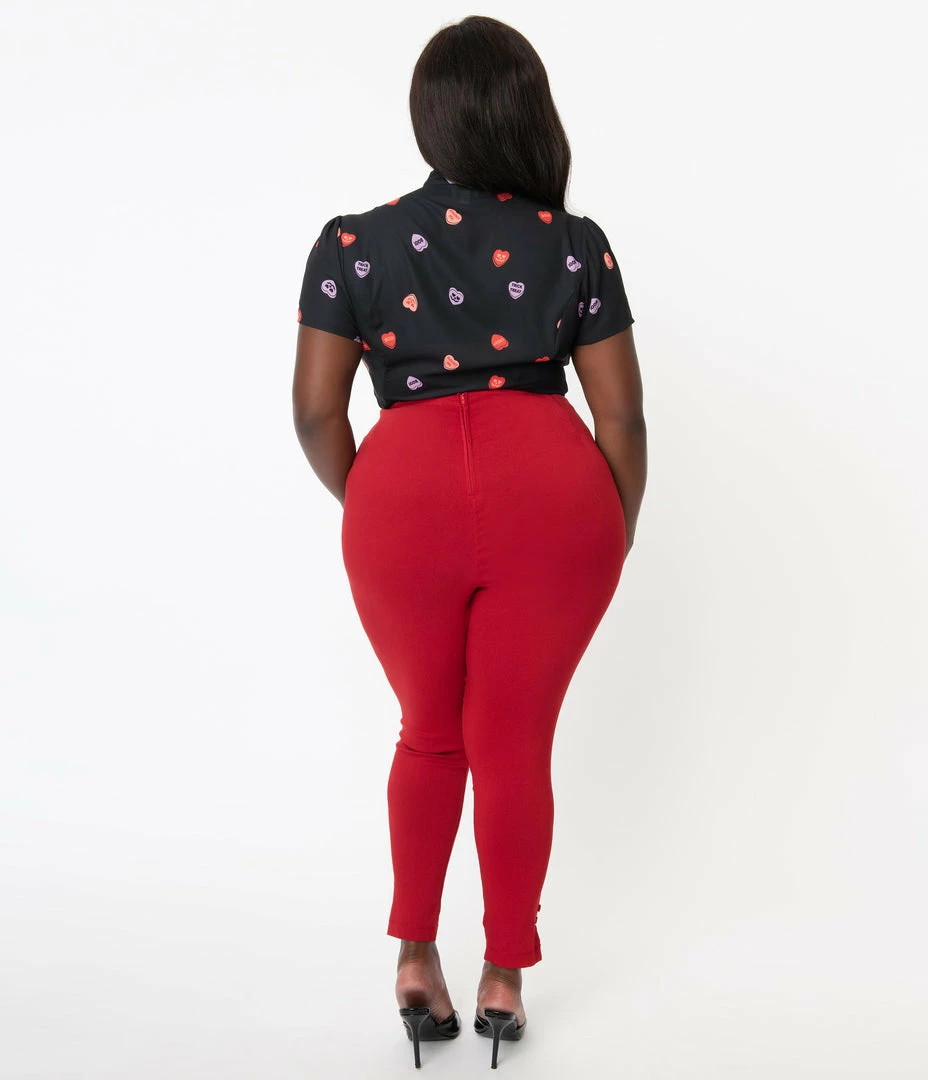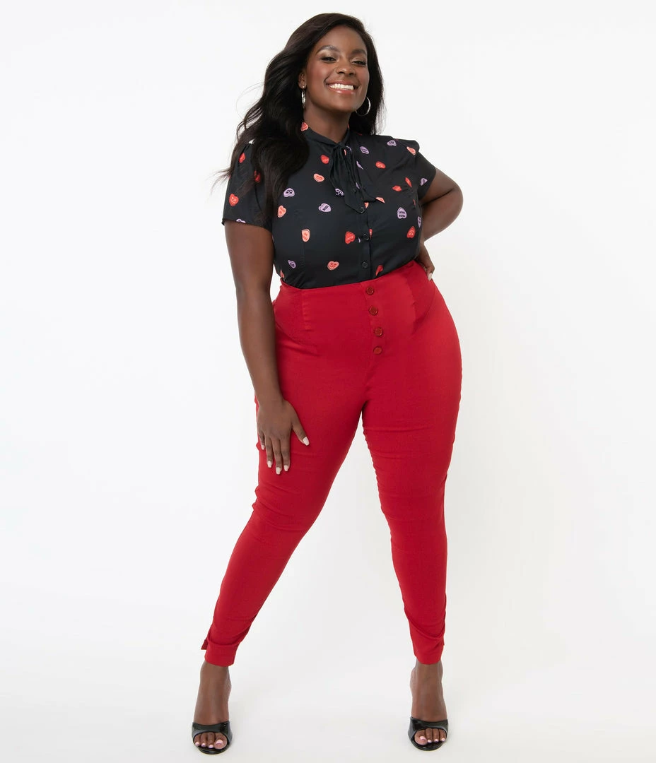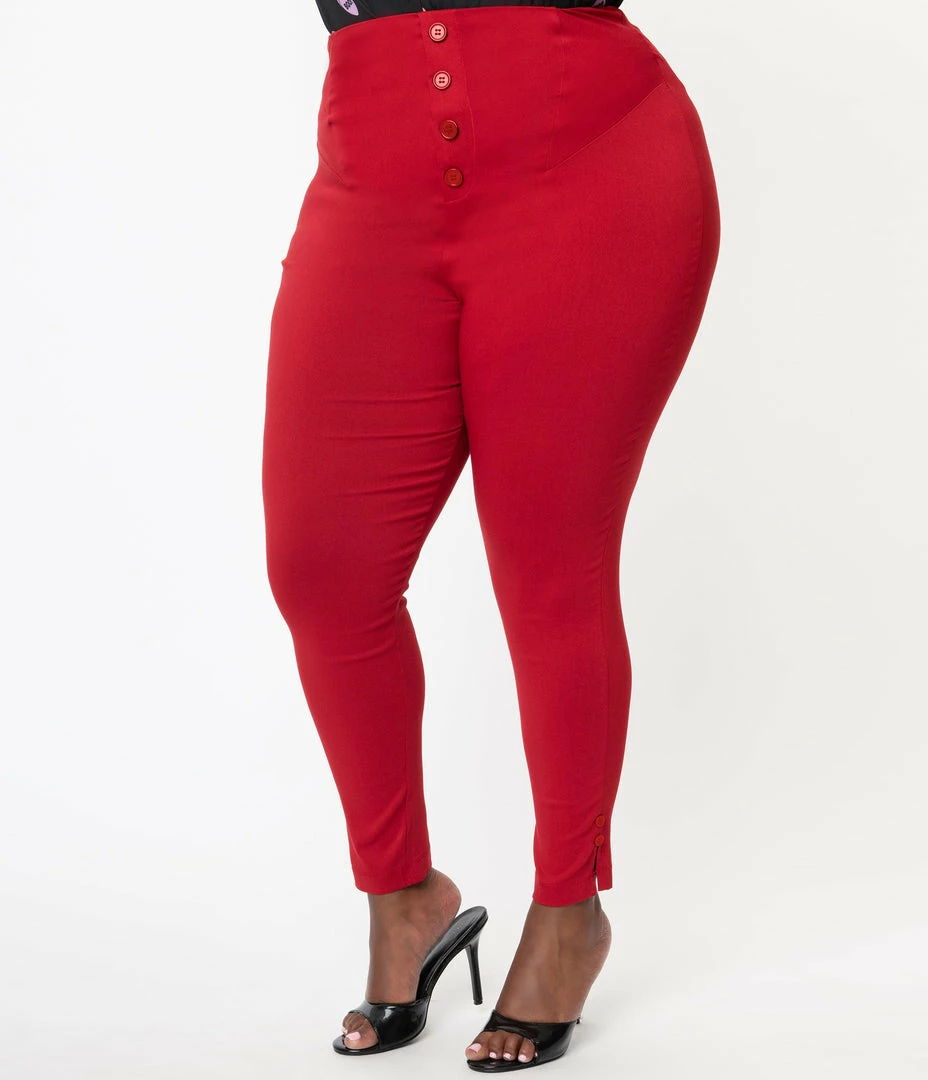Face the music in style, dames! This sensational plus size separate from Unique Vintage is crafted in a marvelous red stretch blend. The Melody Pants boasts a stunning high waist thatโs cinched in the back with a zipper while faux buttons on the front provide retro accent. With flattering skinny legs that drop into a notched cuff and embellished with faux buttons, it takes two to tango!