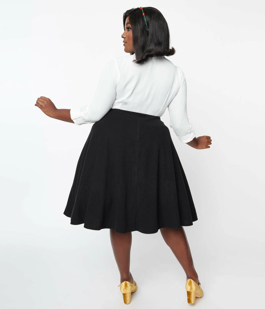 It’s your holiday bestie, dames! The plus size Soda Shop Skirt from Unique Vintage is an ally in the gift-giving spirit with it’s soft felt-like black fabric, cast in a fabulous 1950s swing skirt silhouette. An adorable appliqué of Santa’s favorite reindeer dances on the side with sparkling tinsel leash and a blinking red nose. The banded waist cinches in the back with hidden zipper for a secure fit while convenient side pockets allow you to bring reindeer treats! Whether it’s naughty or nice, you’re set for the next sleigh ride, dears!