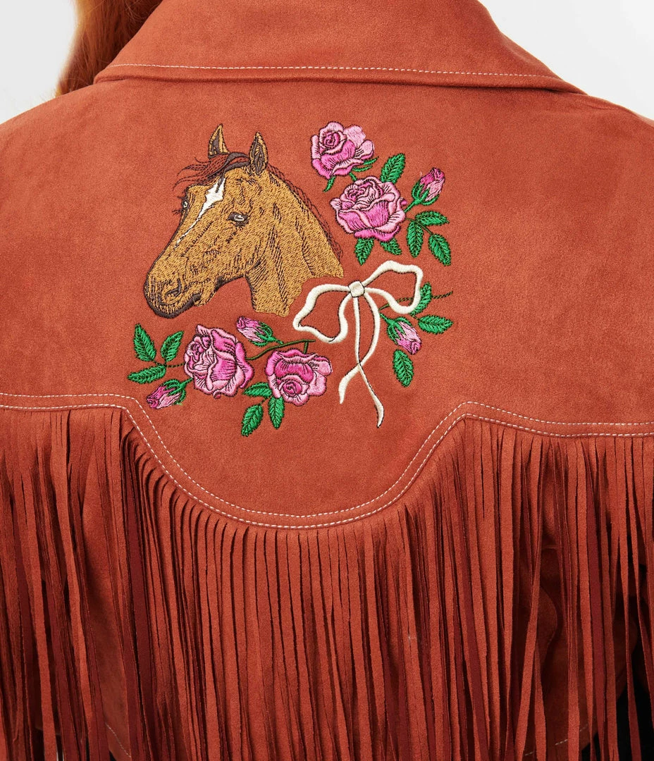 This delightful crop jacket is crafted in a soft rust orange brown faux suede. The back fringed yoke features embroidered roses and a horse.