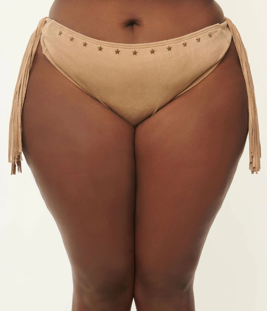 Perfect for the poolside, darling! A sexy plus size swim bottom from Unique Vintage, this sensational western inspired piece features a tan faux sided material, accented with metallic studded stars. The low cut legs feature adjustable self tie and fringed sides and are fully mesh lined for all day comfort!