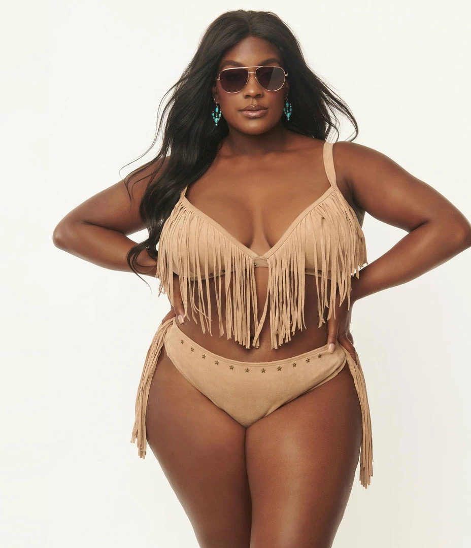 Promo ๐คฉ Unique Vintage Plus Size Tan Suede Fringe Sweet & Sash-y Swim Bottom ๐งจ