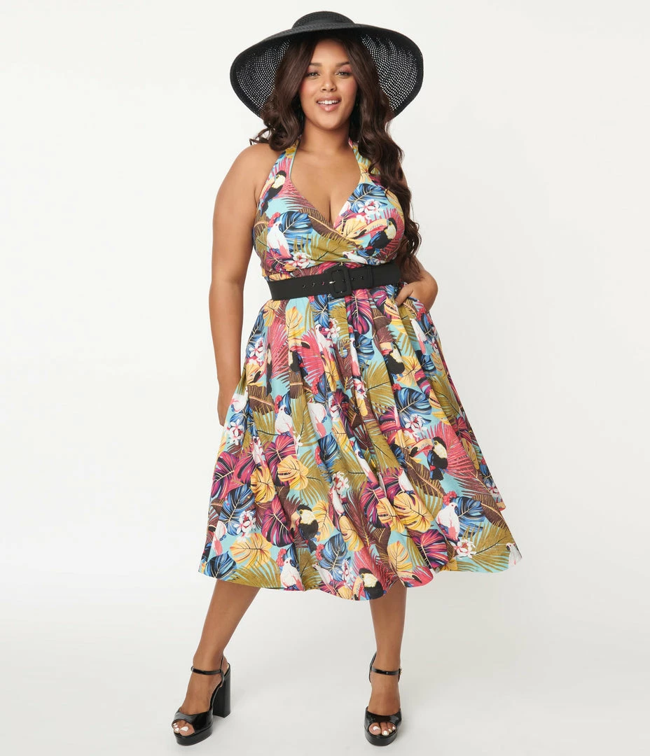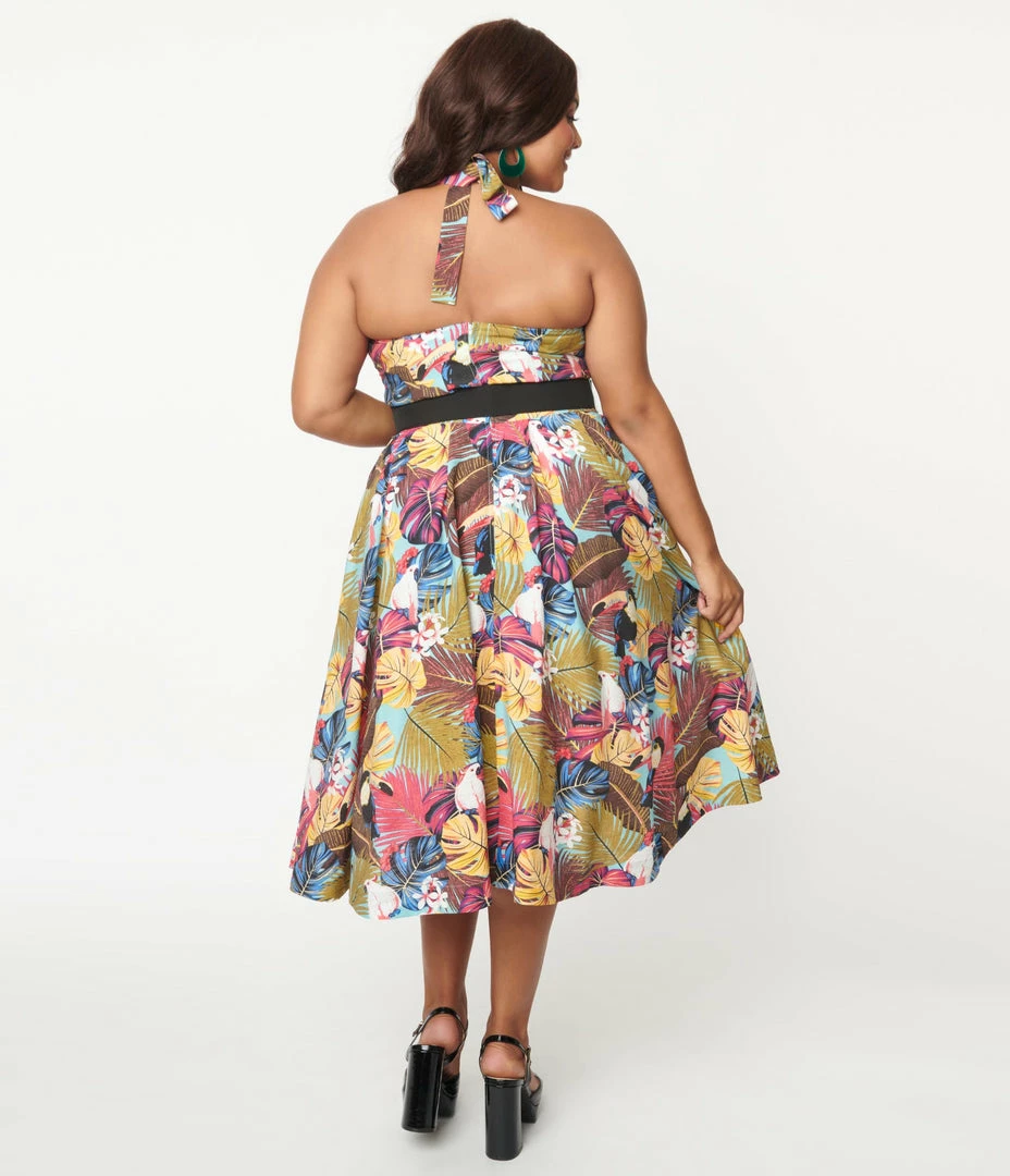 Crafted in a lightweight woven fabric, this plus size swing dress features a multicolor tropical print of toucans, parrots, and tropical foliage throughout. Outfitted with a self tie halter, matching belt, a button up skirt, a back zipper, and side pockets.