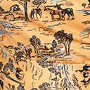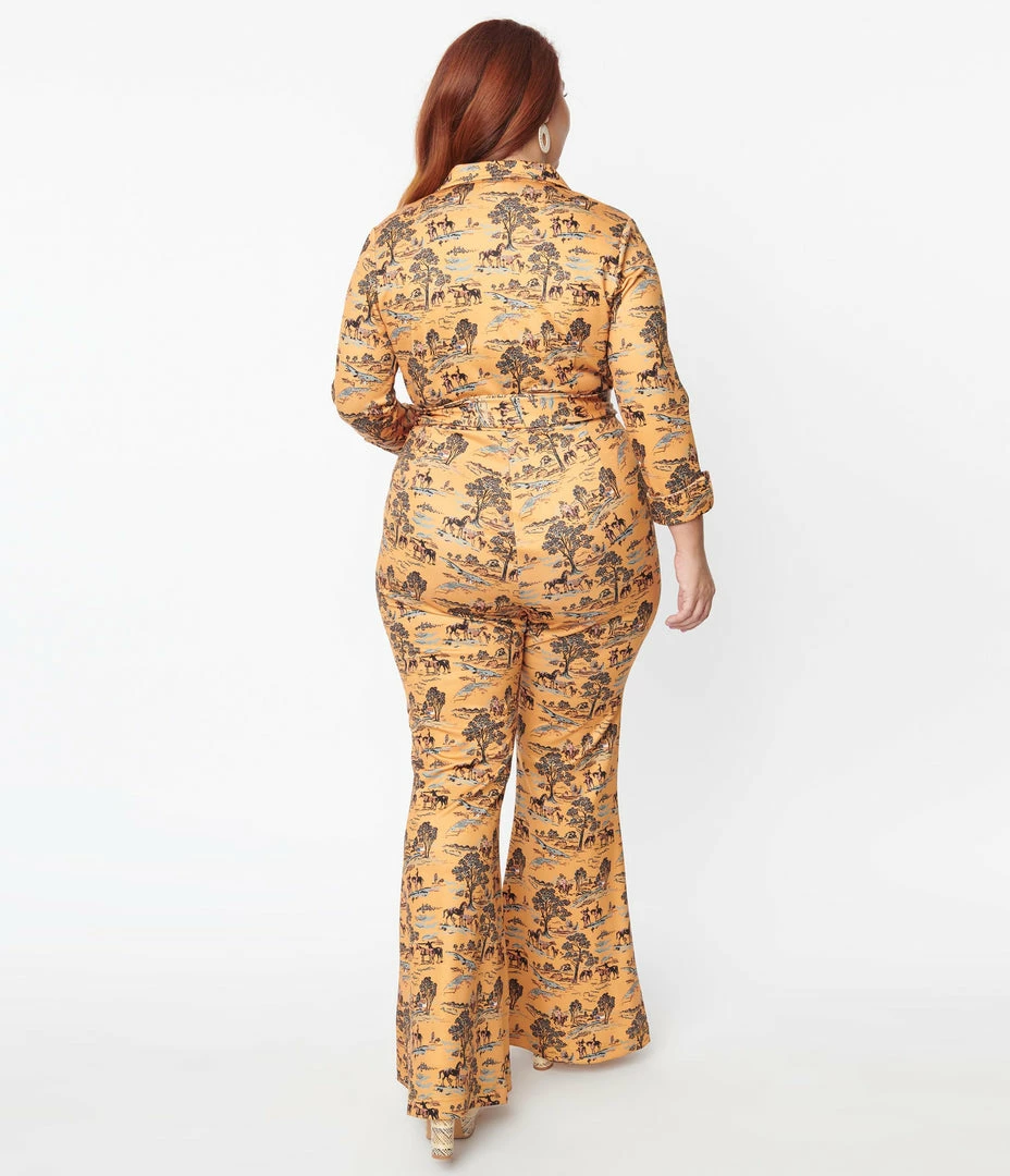 This plus size jumpsuit is cast in a gorgeous knit fabric boasting a sweet toile scene print of cowboys and horses throughout the mustard yellow backdrop. Boasting a sassy self tie wrap bodice that leads to a classic collar, while the dramatic flare legs drop from the seamed waist and dance at your feet!