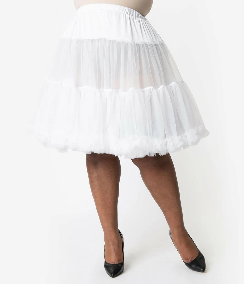 Who doesn’t love a little extra lift, darlings? Add oomph to make your favorite frock look authentically retro with this plus size vintage inspired white ruffled petticoat! This luxuriously soft netted petticoat will give you tons of fabulous volume ideal for the dance floor. Its elastic waist is comfortable, light and easy to wear, boasting two fluffy layers with ruffled hem detail for a feminine touch. Hitting just below the knees for a length that goes with numerous retro-style dresses and crafted with comfort in mind. Voluminous verve achieved!