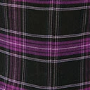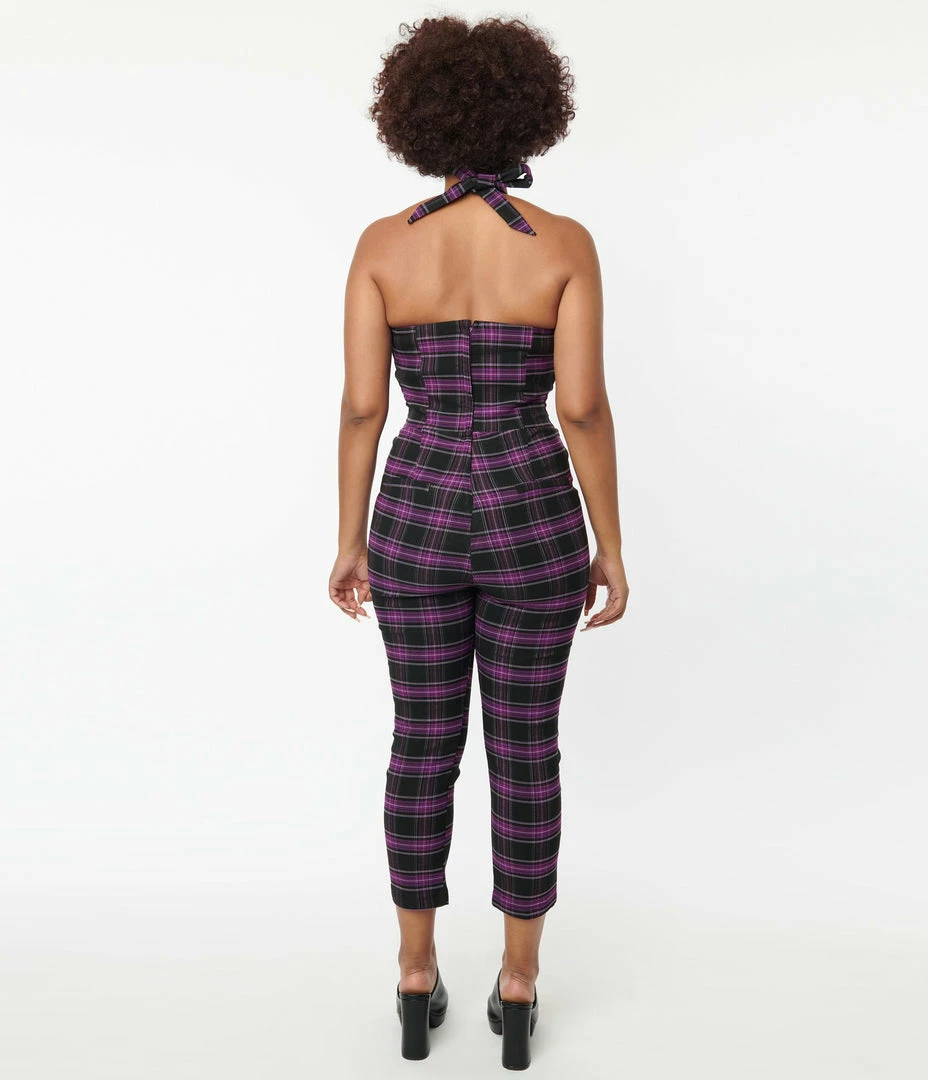 This fabulous jumpsuit is crafted in a stretch bengaline, featuring a purple and black plaid pattern, and is outfitted with self tie halter straps and a back zipper. Complete with functional side pockets and faux back pockets.