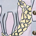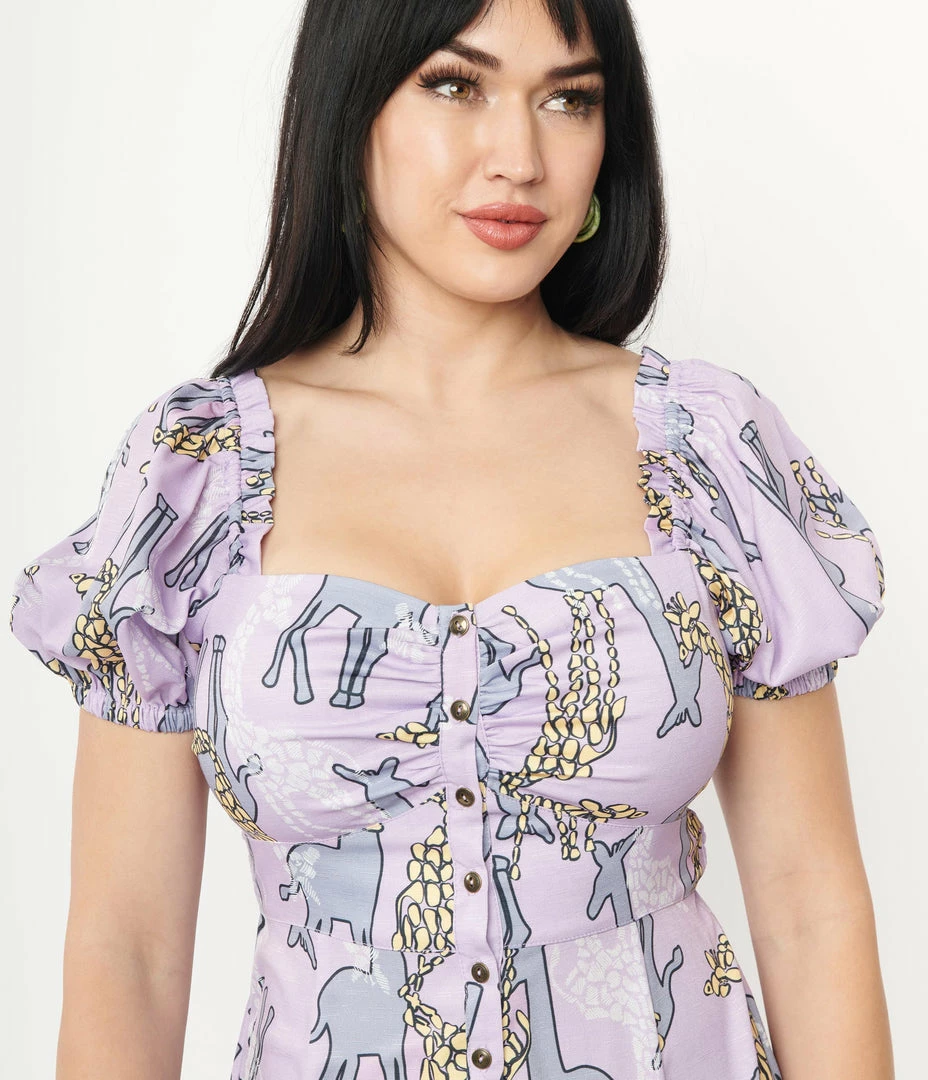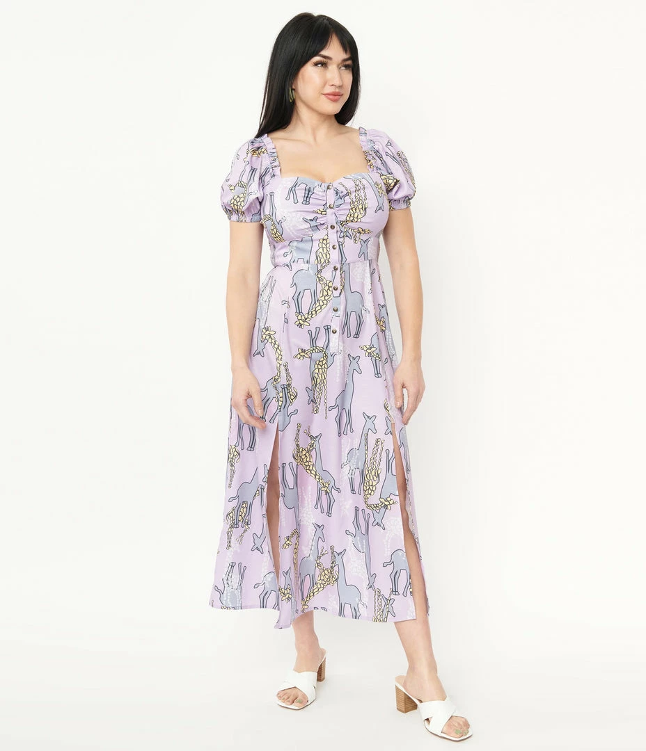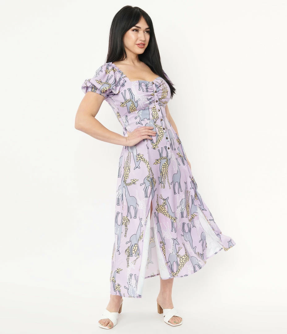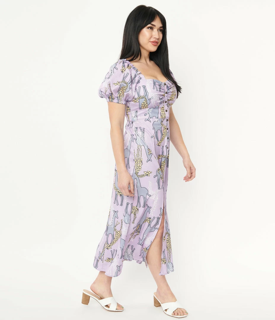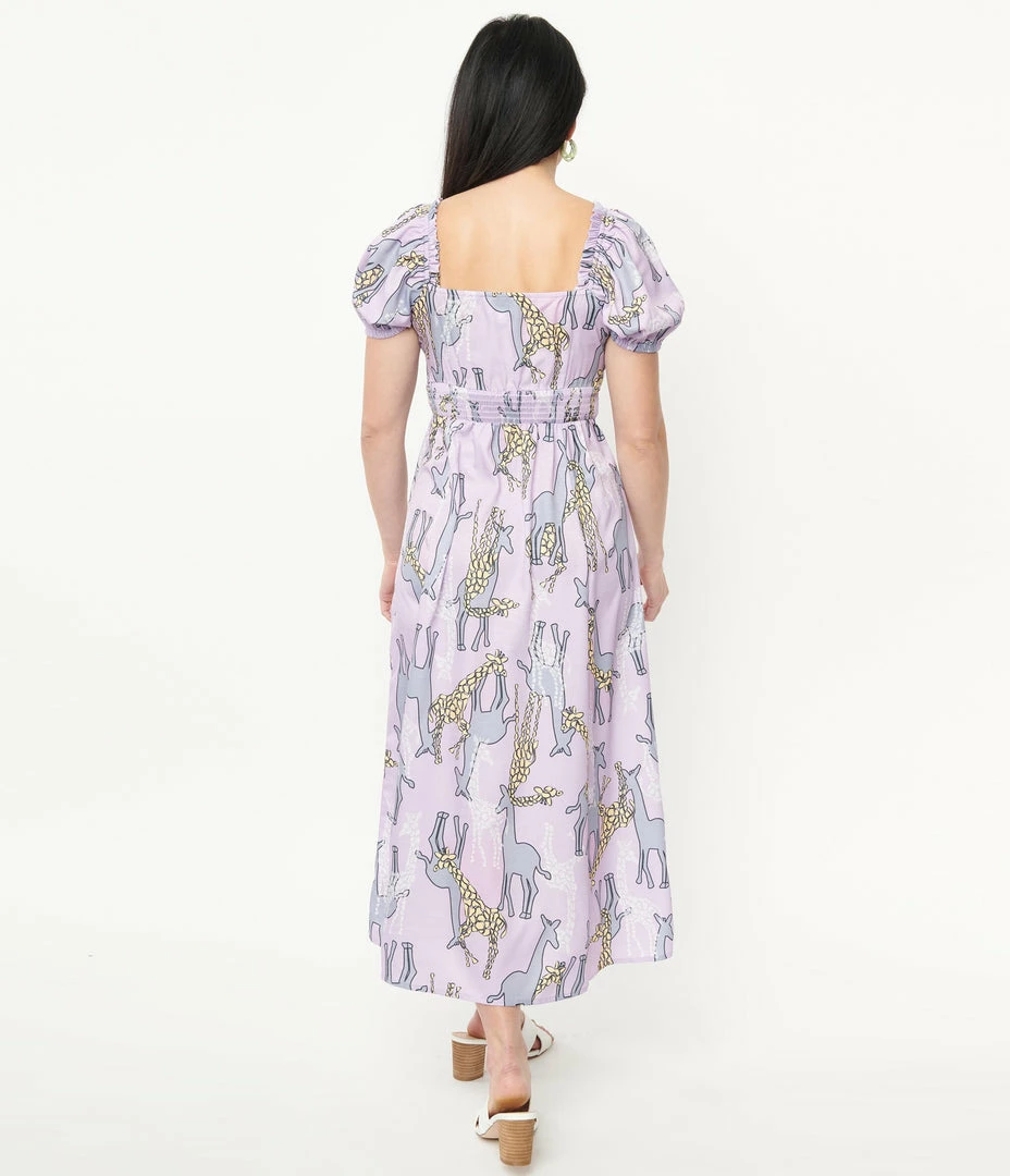 This midi dress is crafted in a lightweight woven fabric that dances with yellow, grey, and white giraffes printed throughout the light purple backdrop. Complete with short Bardot sleeves, a partial button up placket, smocked back waistband, and dual front vents.