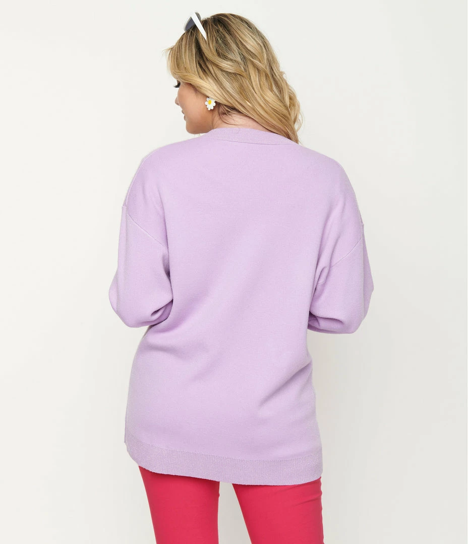 This long cardigan crafted in a soft purple knit blend that dances with fuzzy white clouds and embroidered rainbows. The oversized style is cinched with a button up front and outfitted with side pockets.