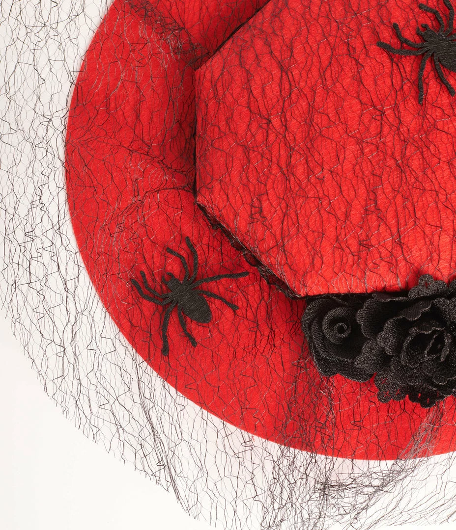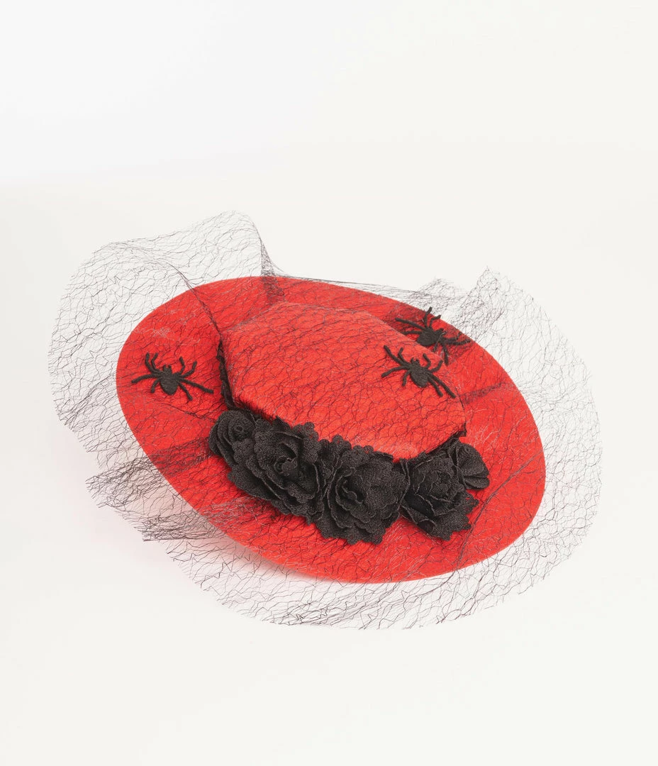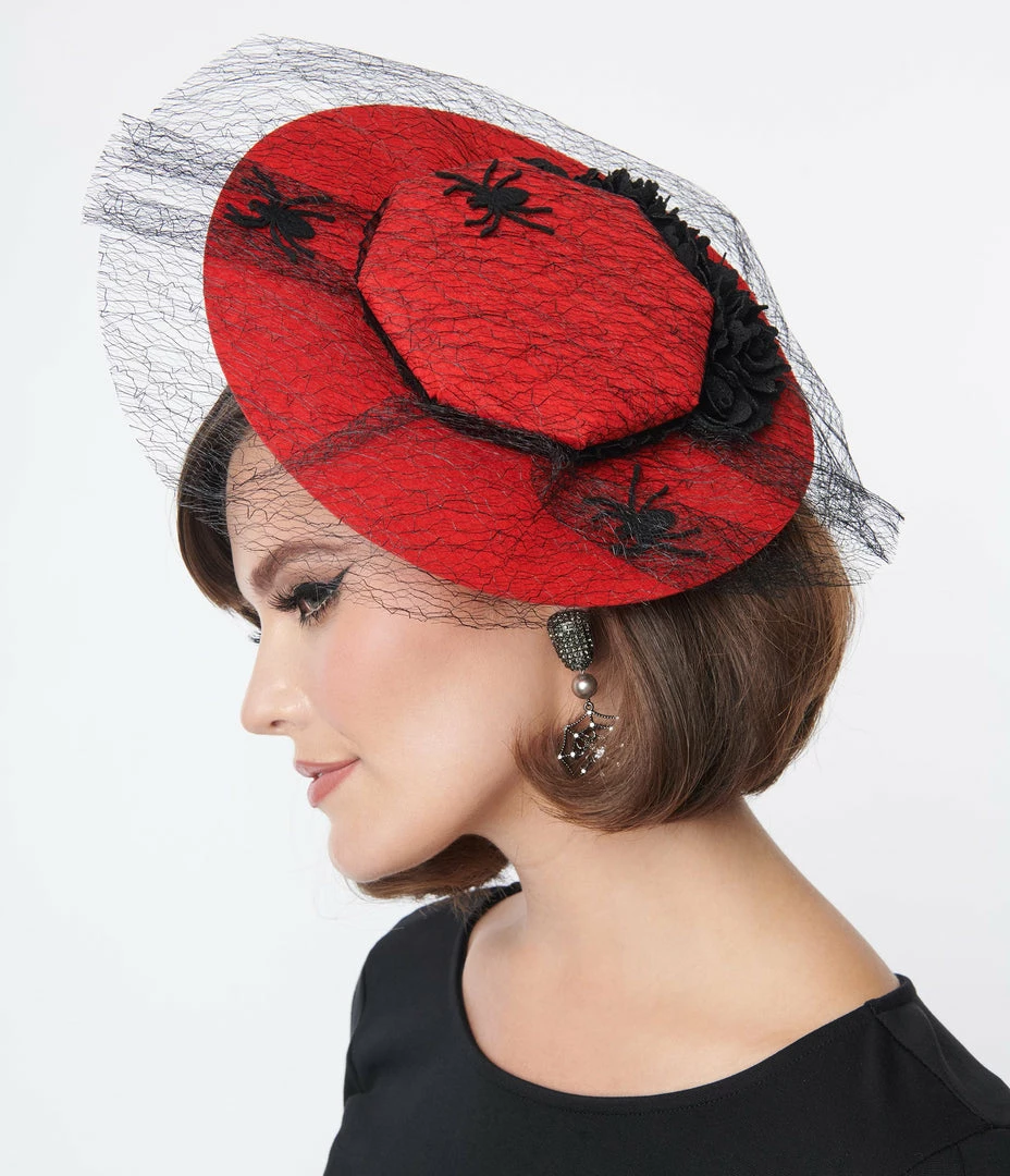 This spine-tingling accessory features a red disc fascinator, crafted in a sturdy felt, and boasting a black spiderweb mesh and darling spiders flying throughout. Two alligator clips secure this hair-raising piece to your ensemble!