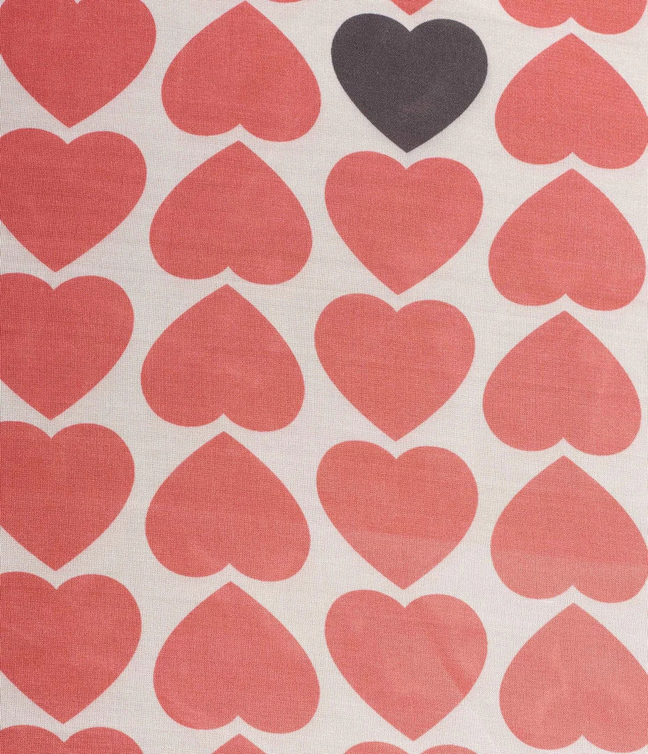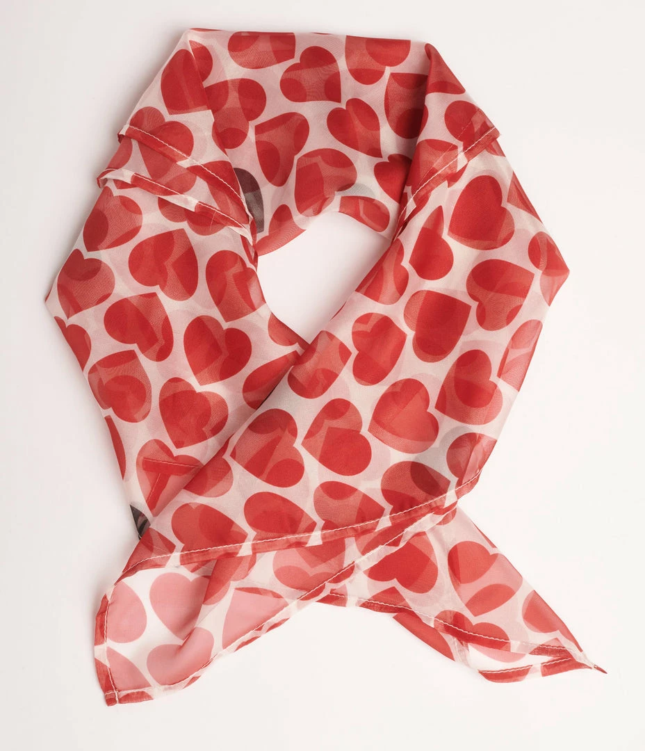 This romantic hair scarf is crafted in a lightweight chiffon-style fabric that dances with red hearts throughout an ivory backdrop, complete with a single black heart for a dash of sass.