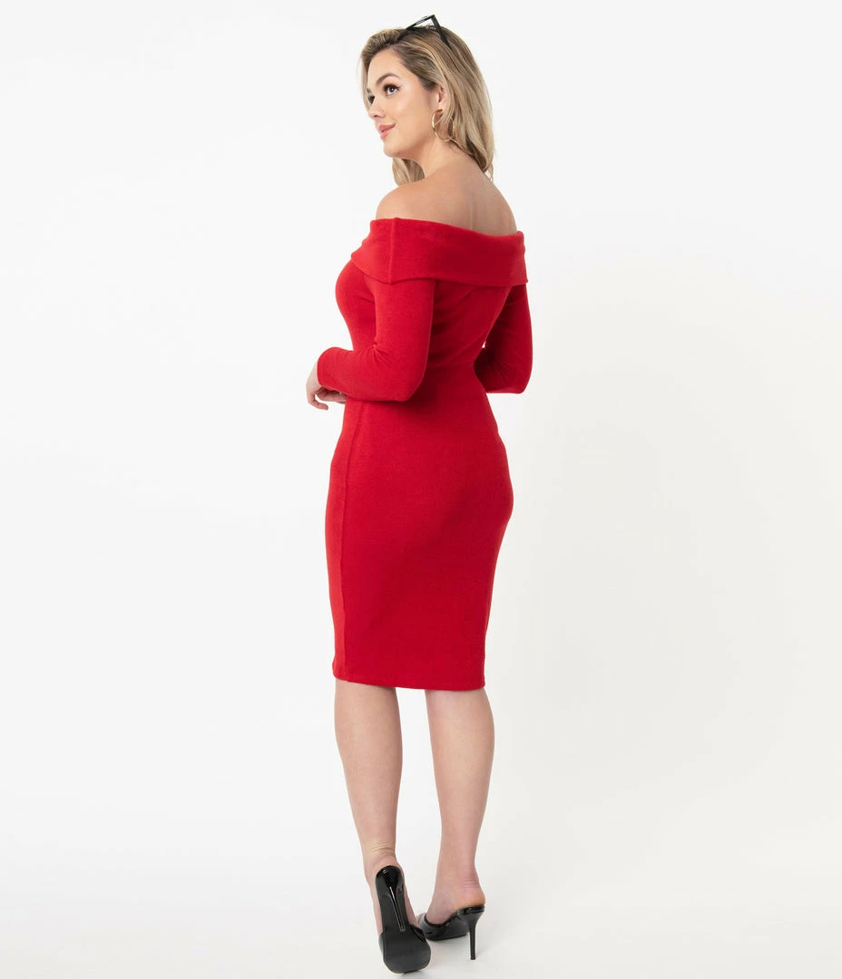 A sultry serving, dames! Stop and stun with this dazzling wiggle, fresh from Unique Vintage and crafted in a flexible knit blend that flatters your hourglass in a brilliant red. The Vickie Dress features a sexy off the shoulder cowl and slender long sleeves for hypnotizing form. The curve clutching design drops to your knees for merciless shape!