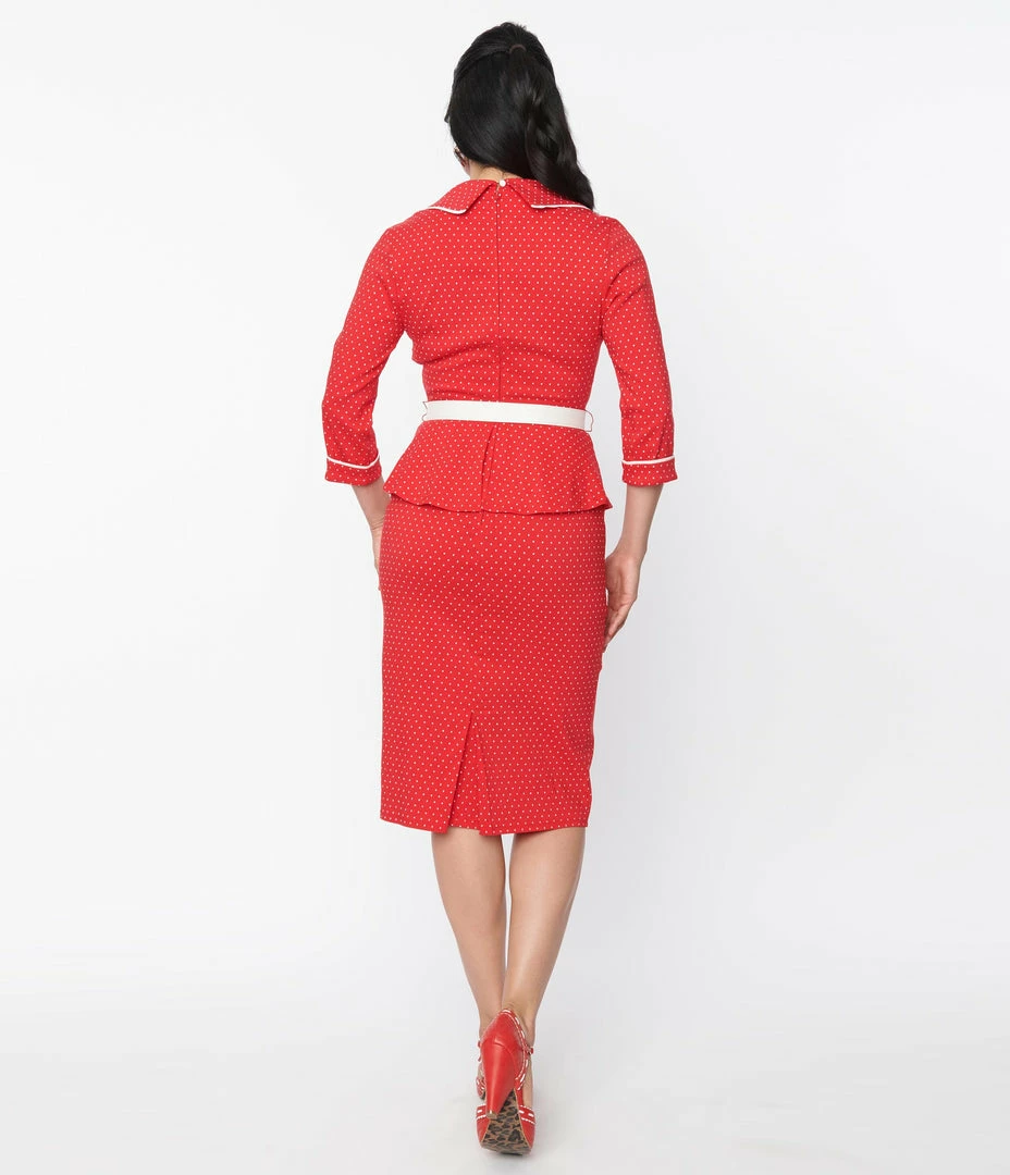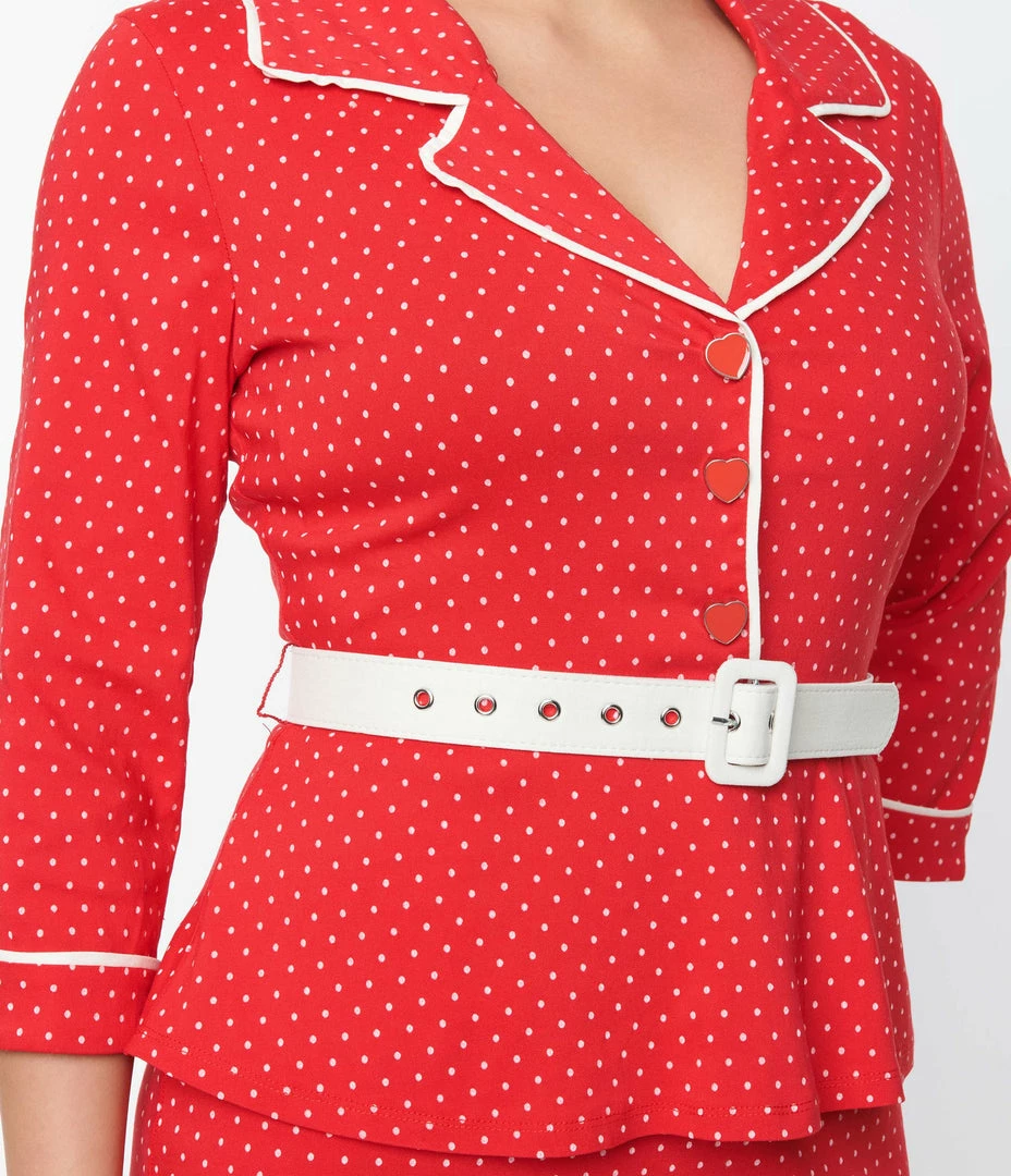 This sultry pencil dress features a delightful white pin dot print throughout a brilliant red backdrop, crafted in a stretch blend for a faux two piece style. Outfitted with heart shaped faux buttons, a belt, and a back zipper.