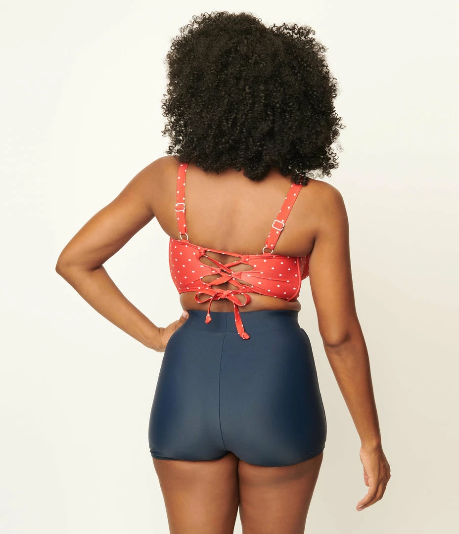 Pin dots are our obsession, gals! A pin-up perfect suit from Unique Vintage, the Marlene crop swim top is crafted in a retro flattering silhouette, with built-in underwire and side boning for support and a fabulous fit. The adjustable straps boosts your bust in retro red while playful white pin dots dance throughout. Marlene laces up the back for pin-up playful design while power mesh helps you maintain comfort. You might just be the hottest thing around this summer.