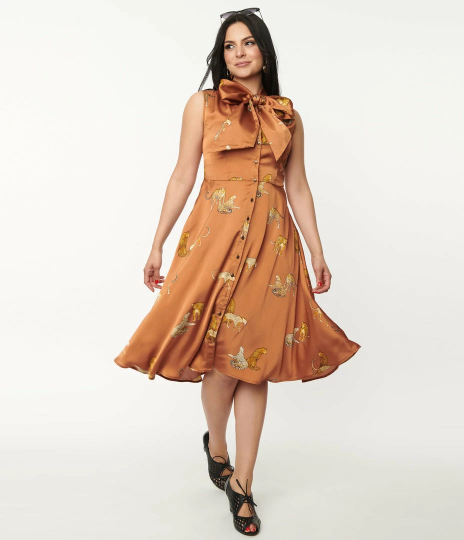 This darling dress is crafted in a lightweight woven fabric that gleams in a gorgeous rust brown and boasts leopard cats printed throughout. The button up front leads to a marvelous self tie bow collar, framed by the sleeveless silhouette. The subtle swing skirt drops from the seamed waist and dances around your knees, complete with side pockets!