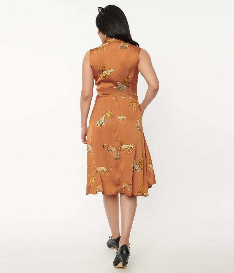 Cheapest ❤️ Unique Vintage Rust & Leopard Cat Print Swing 👗 Dress Sale 🎁