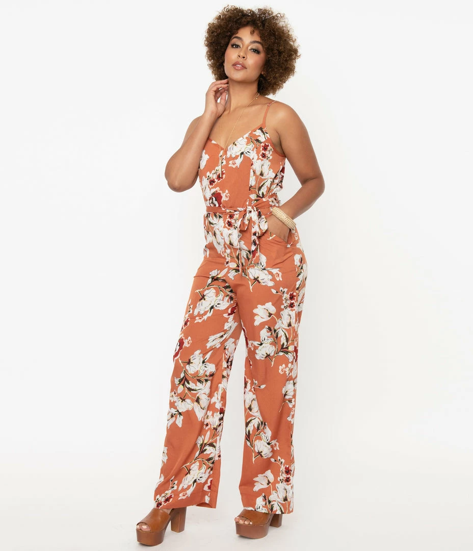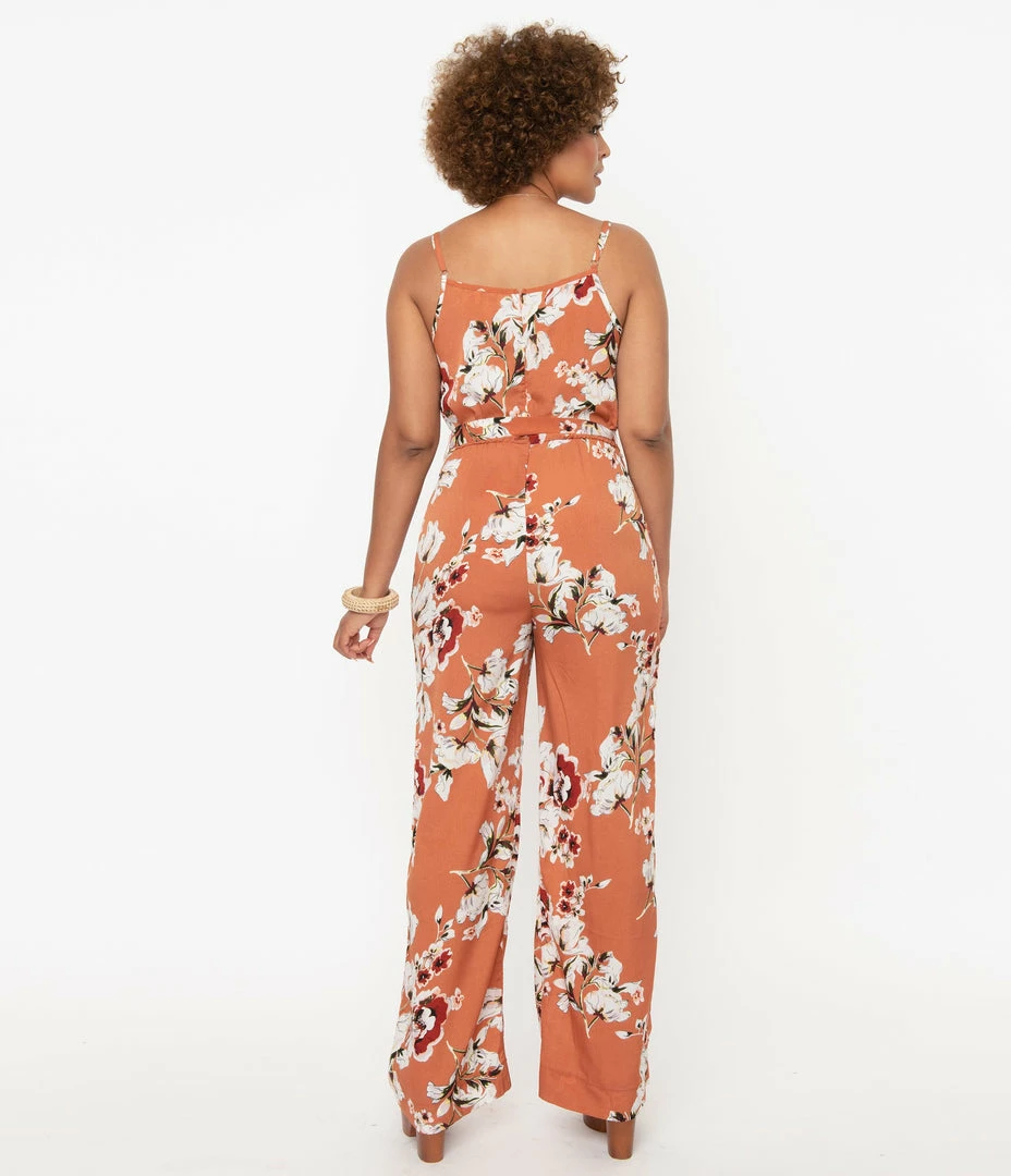 Cheap ⌛ Unique Vintage Rust Orange & Taupe Floral Print Raleigh Jumpsuit ❤️