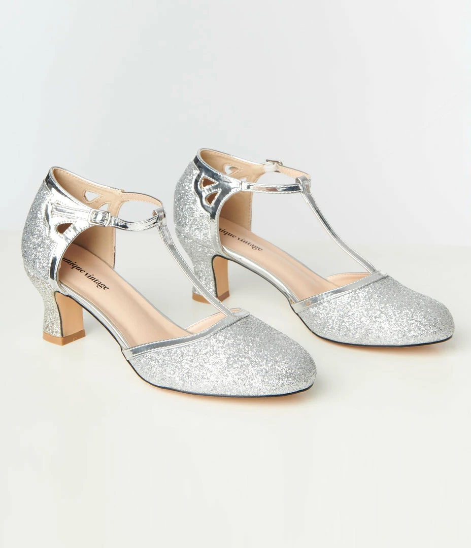Sparkle on the dance floor! An exquisite pair from Unique Vintage, these silver glitter pumps are bursting with super star flair. The closed rounded toe and flexible t-strap lend vintage styling while the gored ankle strap and 2.5โ heel provides a comfortable lift. A show stopping pair perfect for all darlings!