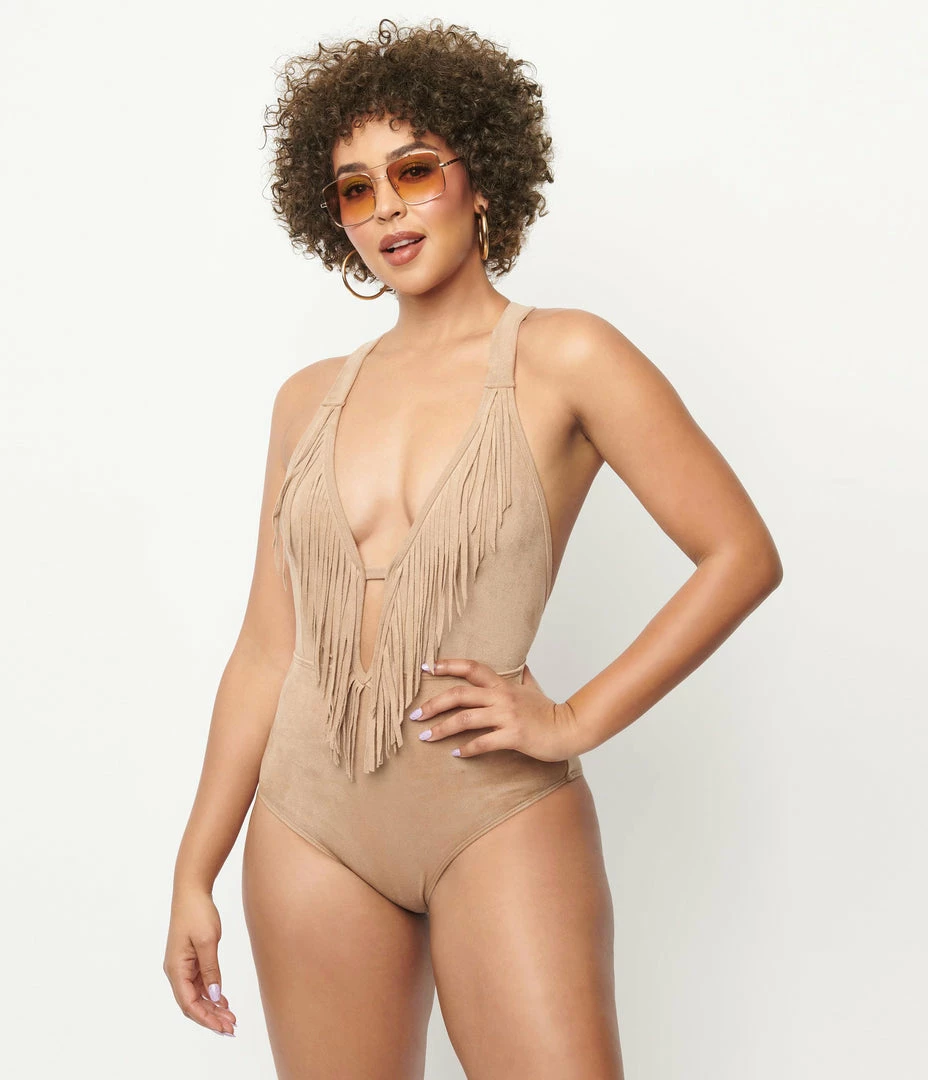 Wholesale ⭐ Unique Vintage Tan Suede Fringe 🩱 Swimsuit 🎉