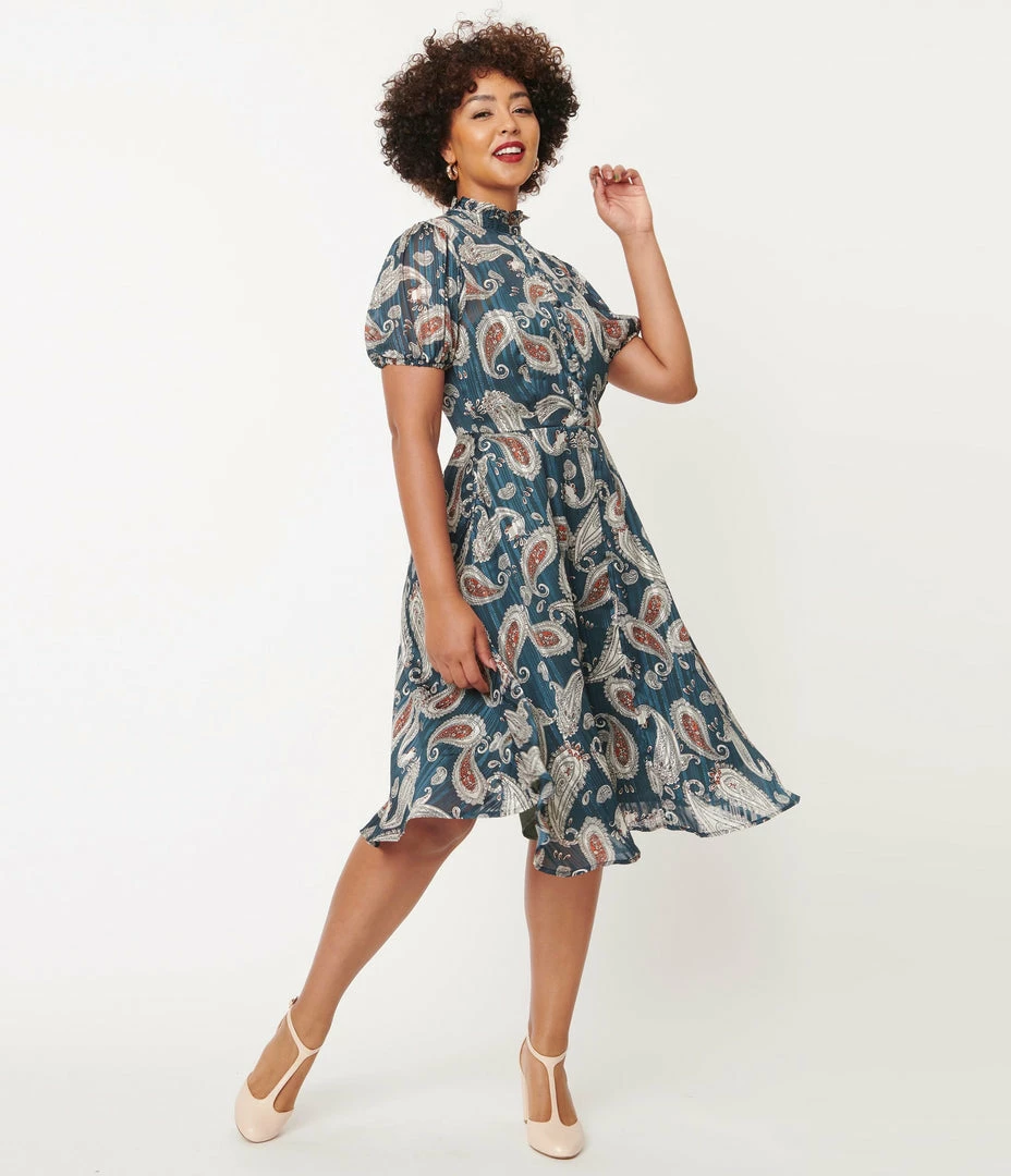 Beloved by all! A romantic silhouette for mid-century dreaming, the Leota Dress from Unique Vintage is an angelic piece crafted in a sheer dark teal mesh that dances with a paisley pattern over dark teal lining. The darted bodice is centered by a faux button up front while the high neckline and elastic cuffed short sleeves provide feminine grace. The seamed waist is secured with a back zipper and a button up keyhole while the sweeping swing skirt is outfitted with side pockets!