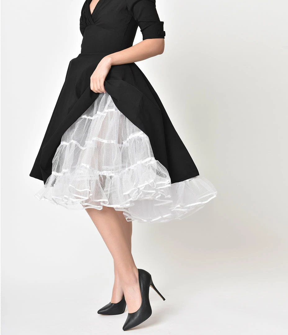 Fashion in the 1950s was known for its dramatically fun, flared skirts and voluminous dresses, and stylish ladies of that time achieved this swinging effect by pairing their polka dot dresses with matching crinoline petticoats. Unique Vintage offers authentic options like this white tea length crinoline petticoat to help you get the very same look, darling, but ours have a few modern updates to keep them perfectly current and undeniably comfortable. This white petticoat is made of a stiff, sturdy crinoline that will give your skirt an attractive bell shape, and it even offers a bit of extra movement while you walk. Matching ribbon bindings separate each tier of fabric, and there are multiple layers of material so that it never falls flat. The elastic waistband of this white petticoat also fits most women, so youโll feel loose and comfortable even while adding extra lift to your retro ensemble!