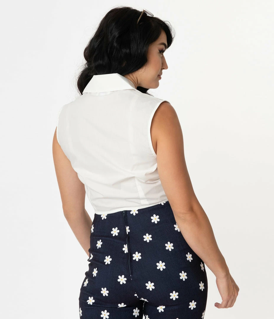 Get the beach craze started, darling! This sweet button up crop top from Unique Vintage is cast in a lightweight and smooth white fabric. A fabulous notched lapel and darling chest pocket lend retro accent to this sleeveless separate while the front self tie adds sweet styling to your ensemble. Take the world on vacation!