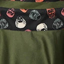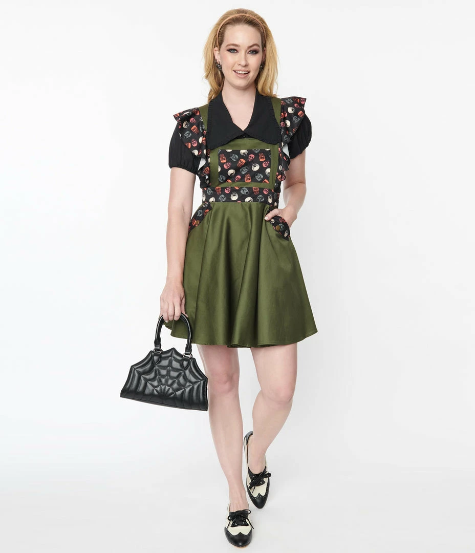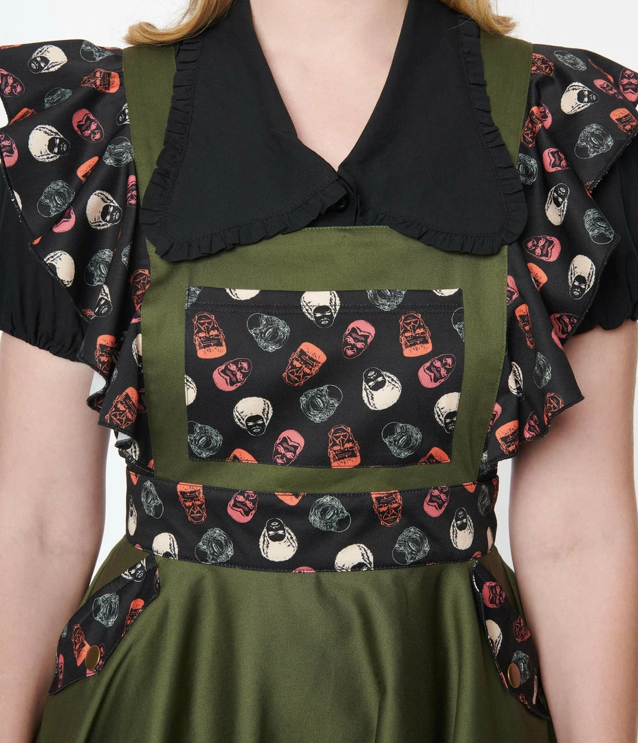 This rockabilly pinafore, in collaboration with Universal Monsters, is crafted in a dazzling woven olive green and boasts bib and ruffle accents on the iconic monster head in orange, white, and gray throughout a black backdrop. Complete with button adjustable straps, back zipper, and functional side and chest pockets.