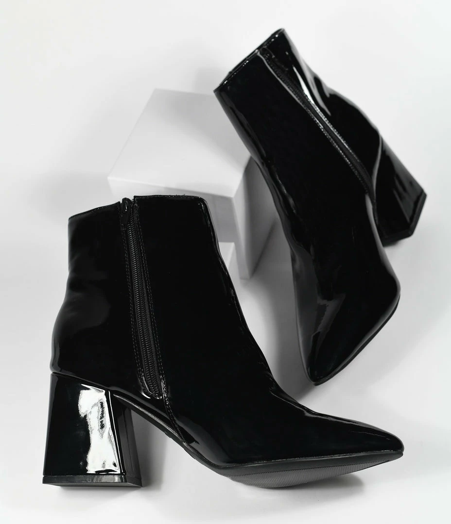 Bring some confidence to your step with these gleaming black booties, crafted in patent leatherette and featuring a sturdy 3 inch block heel. Secured with a side zipper and comfortable with a cushioned insole, provide some edge to your ensemble with the pointed toe!