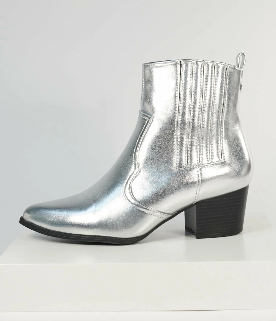 Stroll through the stars in these gleaming booties, crafted in a fabulous metallic silver leatherette and boasting a 2.5 inch block heel for comfortable frolics. Secured with elastic side bands for an easy addition to your retro ensemble!