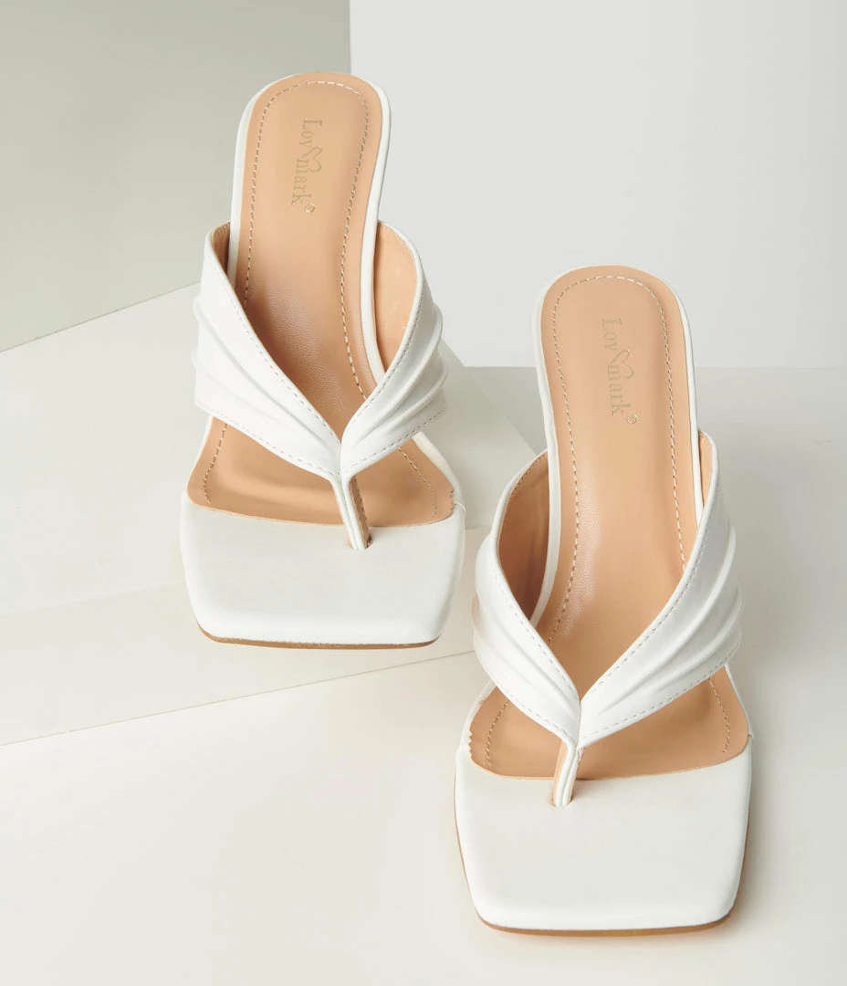 For fabulous frolics, these dainty slip on sandals are crafted in white leatherette and feature a pleated sandal vamp, 4 inch stiletto heel, and a cushion insole!