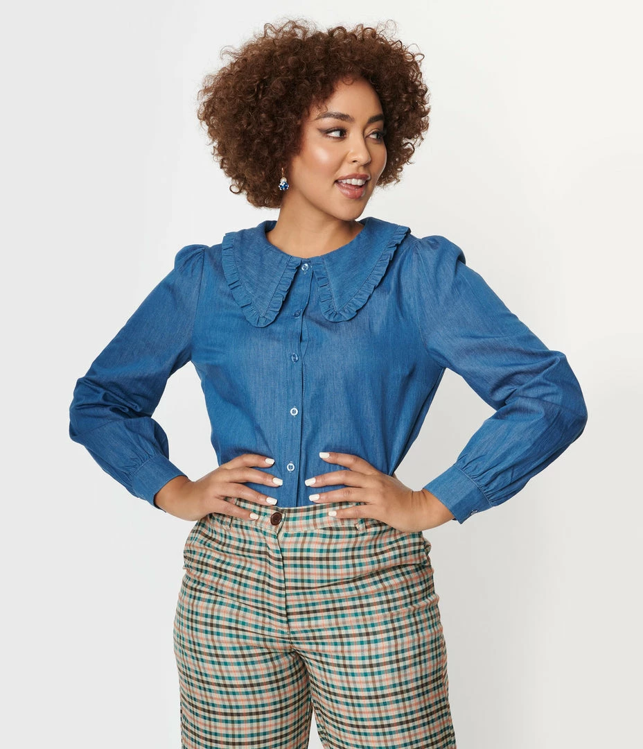 A clear horizon is all you need, dames! Revel in this rockabilly inspired blouse, crafted in a marvelous indigo blue cotton denim. The button up front leads to a puritan styled collar, embellished with dainty ruffles, while the long sleeves drop into a button cuff. Complete with a curved hemline for perfect pairing!