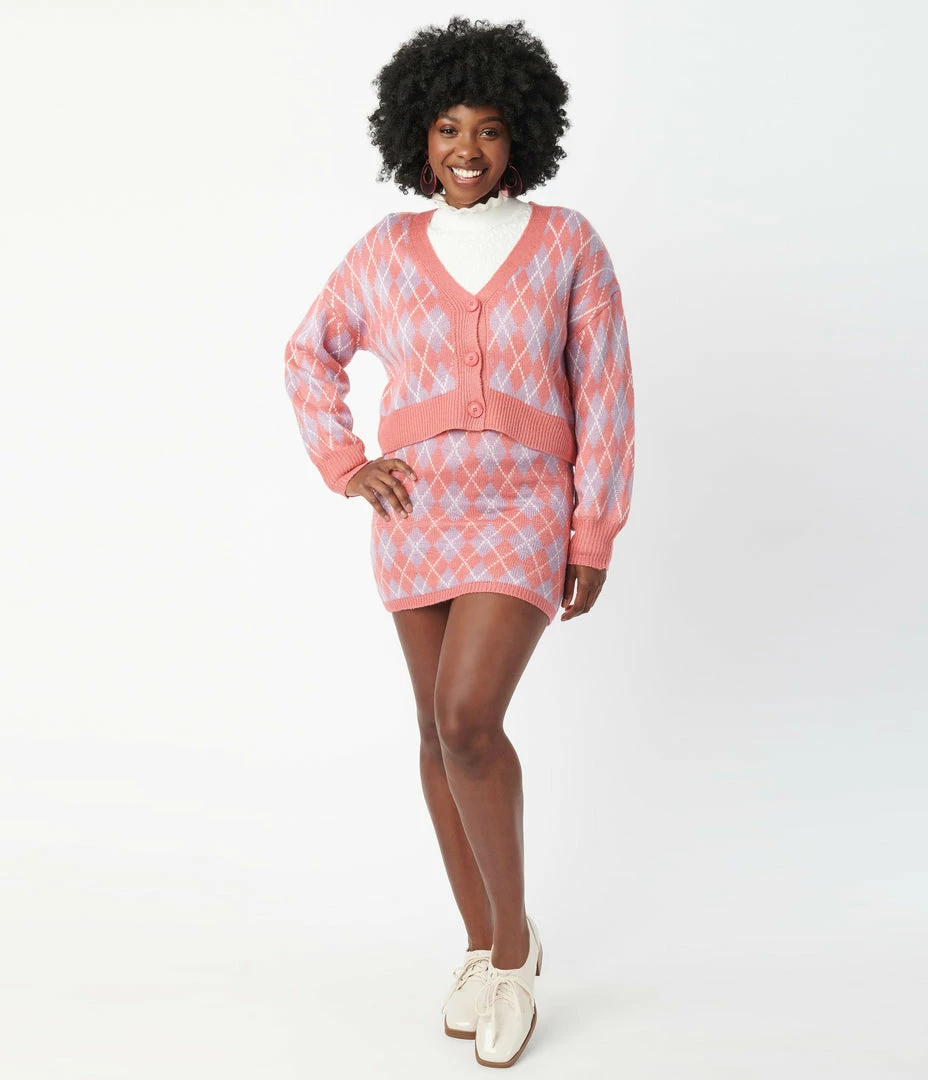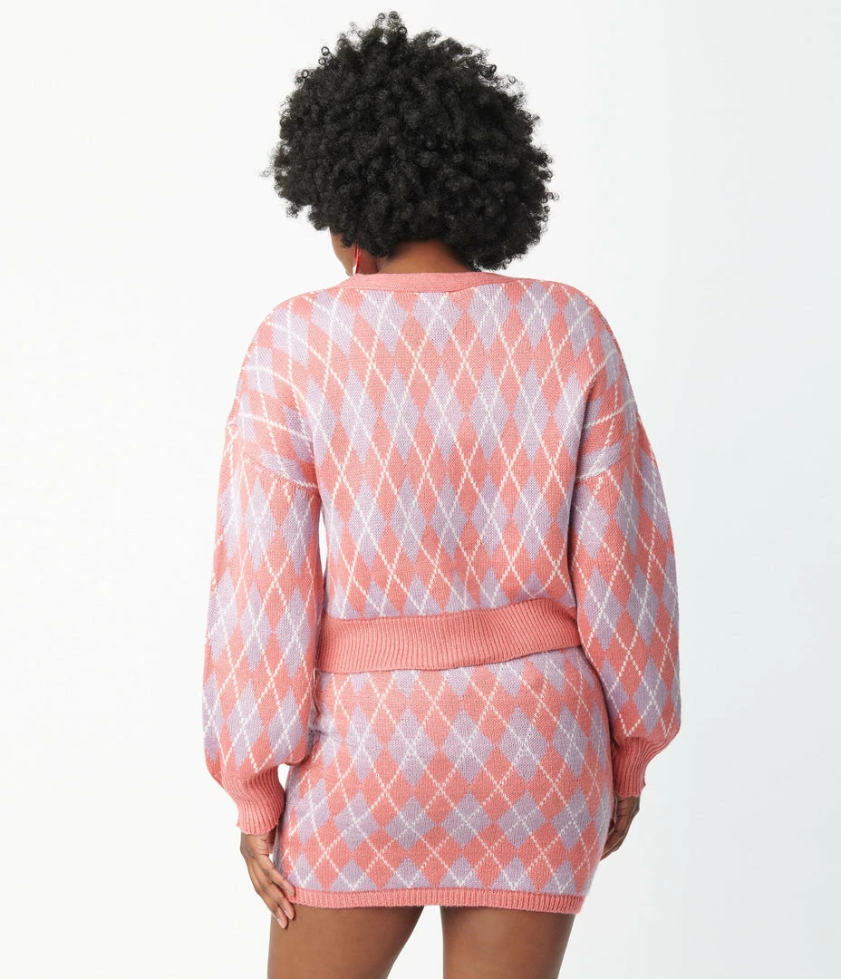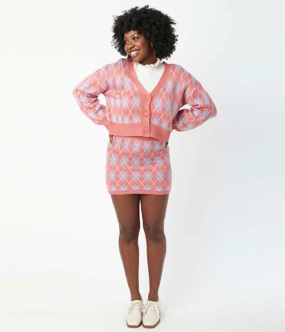 Go get ‘em, gals! This adorable separate is crafted in a soft stretch sweater knit and boasts a classic argyle pattern in pink, light purple, and white. The wide banded waist is cinched with elastic while the subtle A-line skirt flatters your curves!