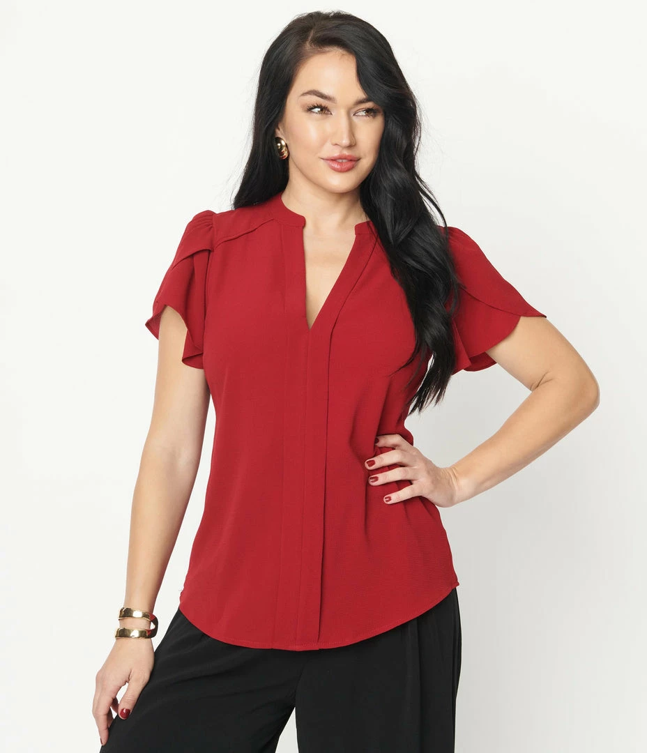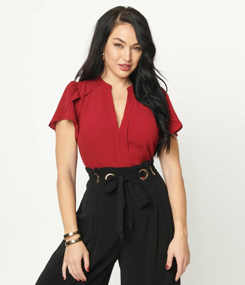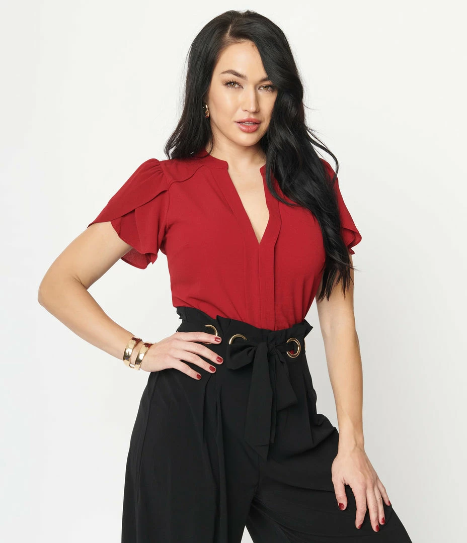 Simply divine, dames! This darling separate is crafted in a burgundy crepe fabric. The V-neck is centered by a dual placket down the front seam of the bodice, and framed by shoulder yokes leading to the sweet tulip sleeves. Complete with subtle darting and curved hem for a flattering fit!