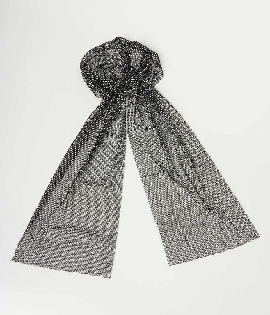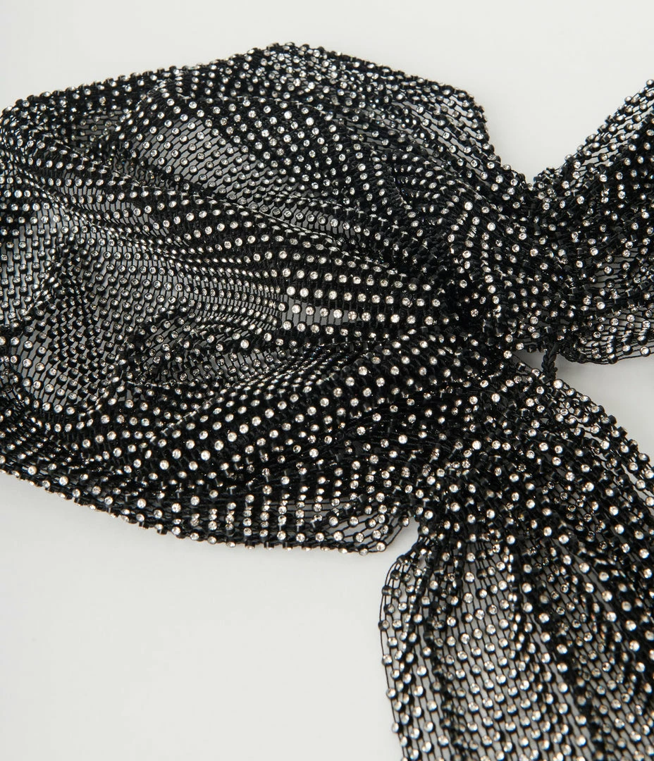This retro headscarf is crafted in black mesh with elastic threading that sparkles with silver rhinestones throughout. Designed with a cap and two long ties.