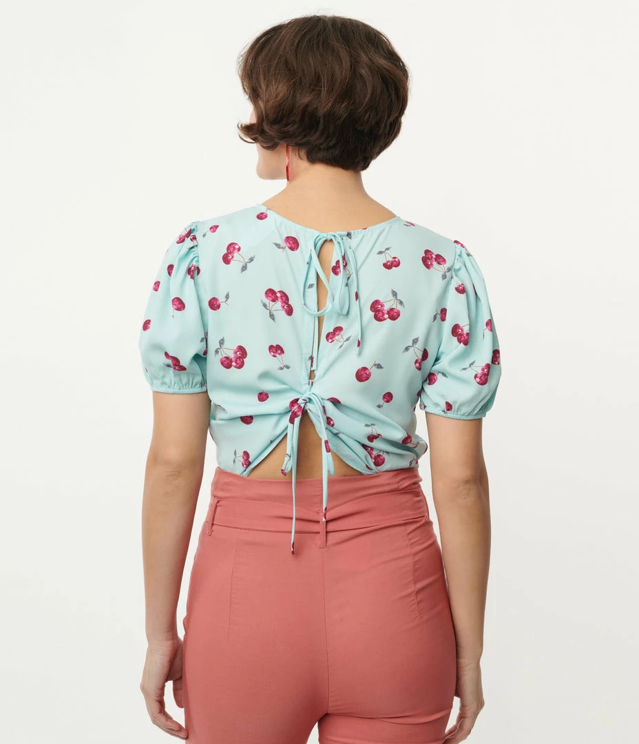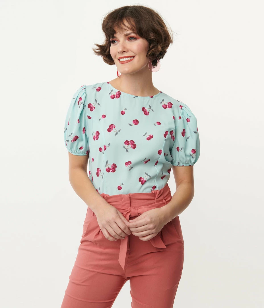 Sweet as pie! This charming blouse is crafted in a mint blue woven fabric that dances with pink cherries throughout. The princess seamed bodice flatters your curves while the modest neckline is secured in the back with a self tie keyhole, and framed by short puff sleeves. Complete with self tie gathered back!