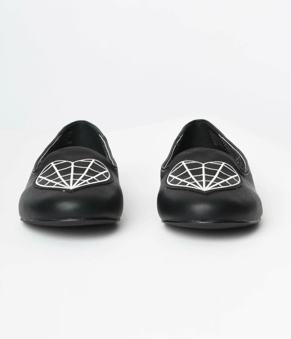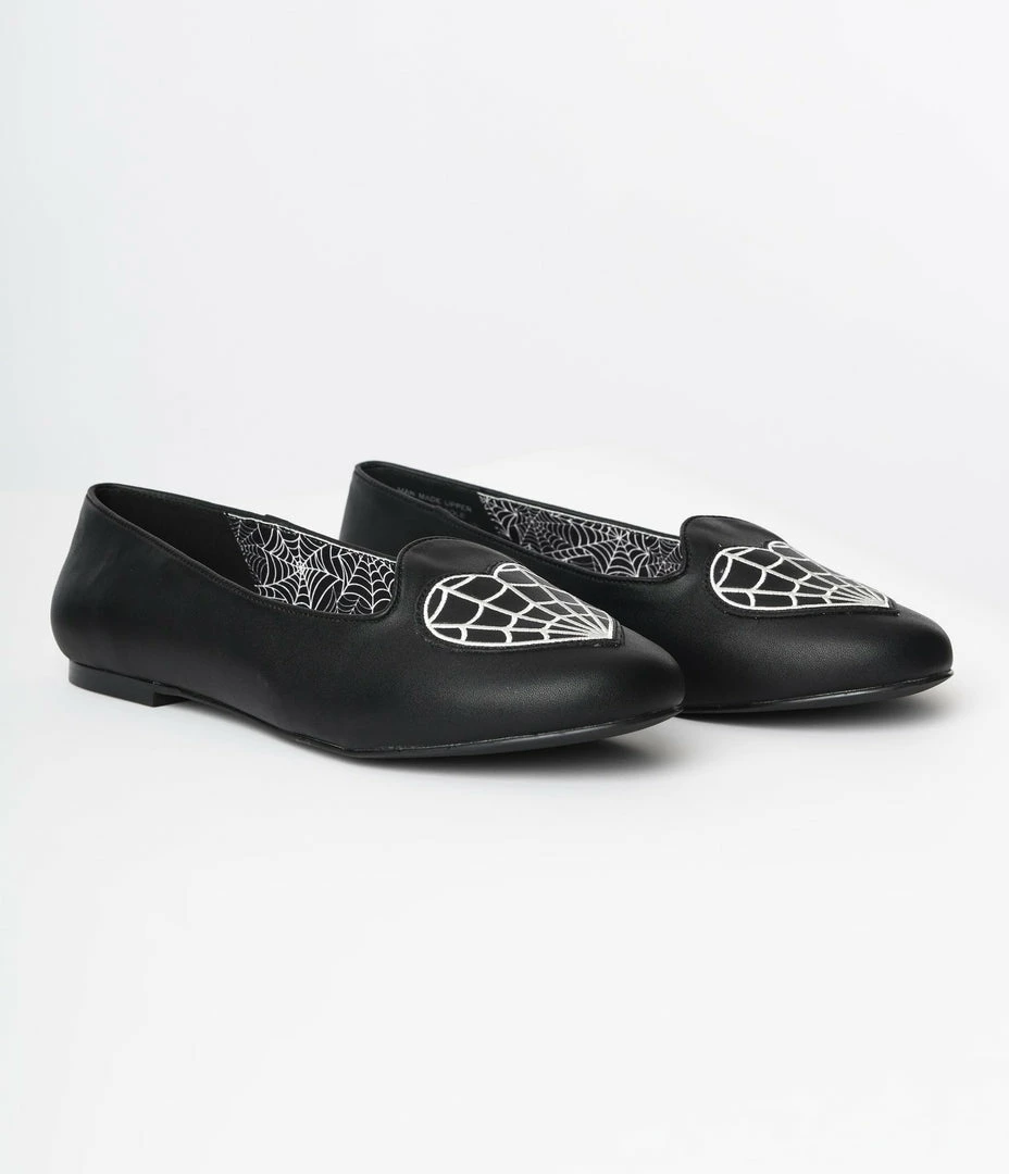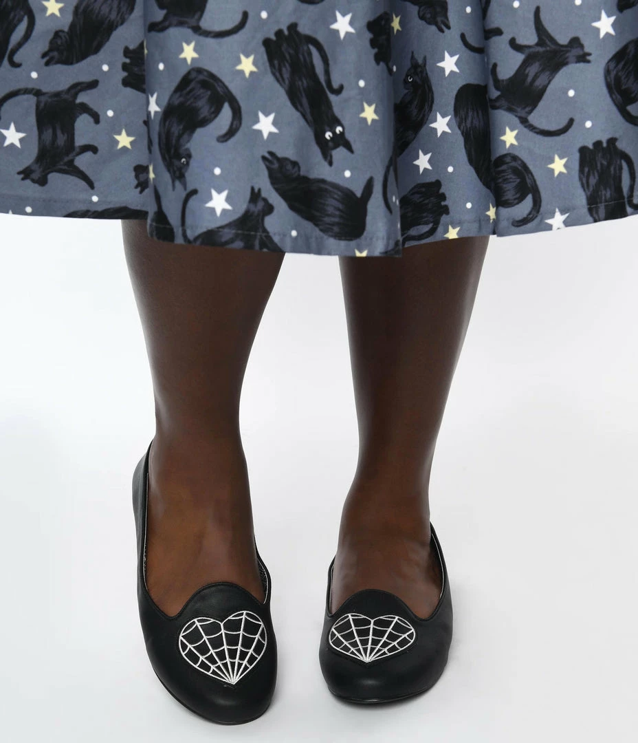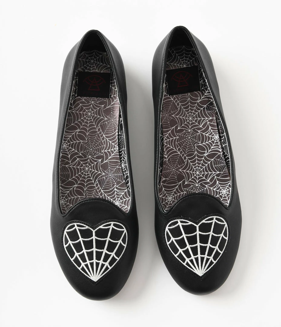 Be careful! You might accidentally fall into the web, fall in love that is. These adorably crafted black flats are made of 100% vegan leather with a rubber outsole, delicately decorated with a white embroidered spider web heart detail.